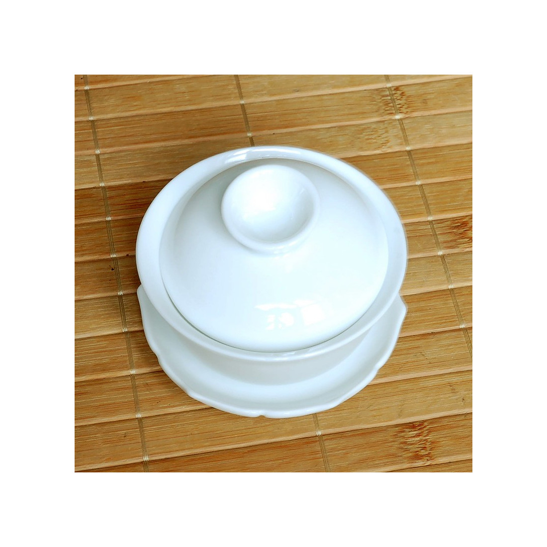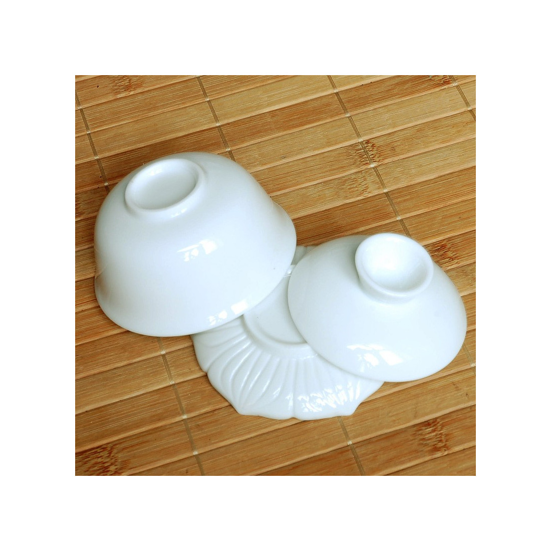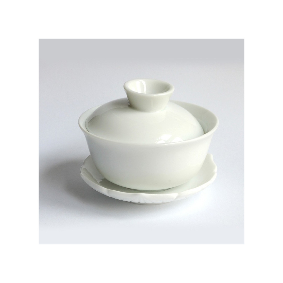 Невелика біла гайвань лунцюанського випалу. Блюдце вирізане у вигляді квітки. Стінки гайвані товсті.