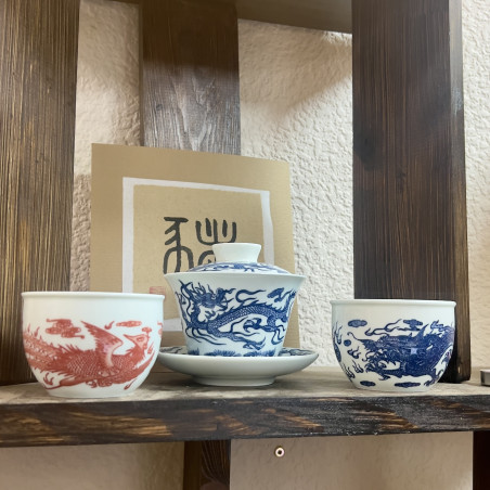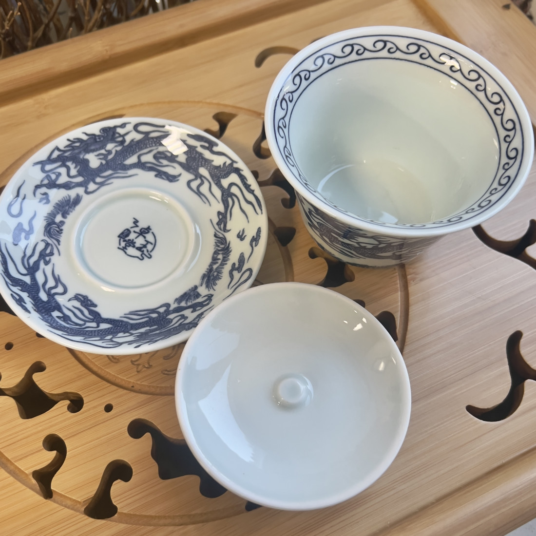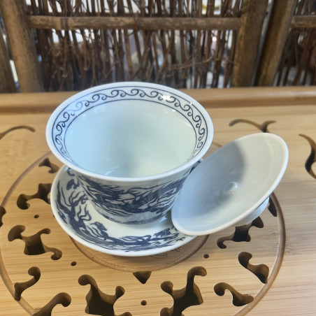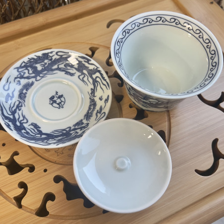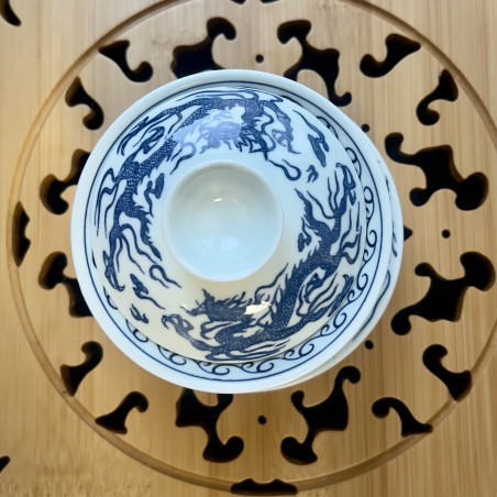Акуратна і дуже приємна гайвань з порцеляни із зображенням двох драконів. Особливістю конструкції можна назвати "ніжку" на внутрішній стороні кришки, яка дозволяє закріплювати її на стінці гайвані, залишаючи у відкритому стані.