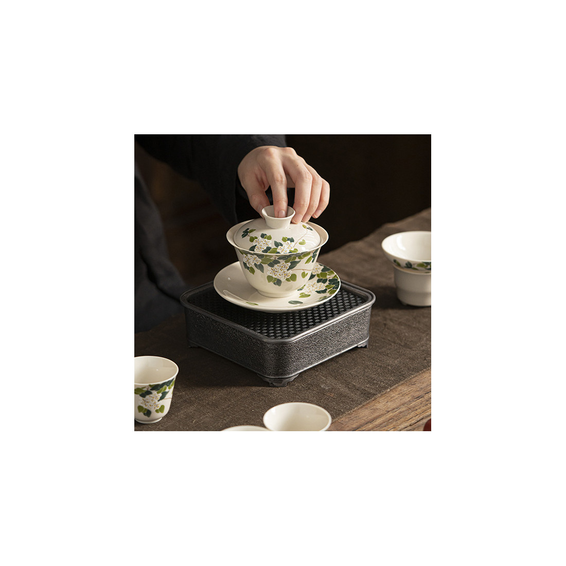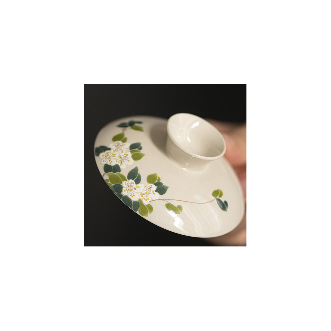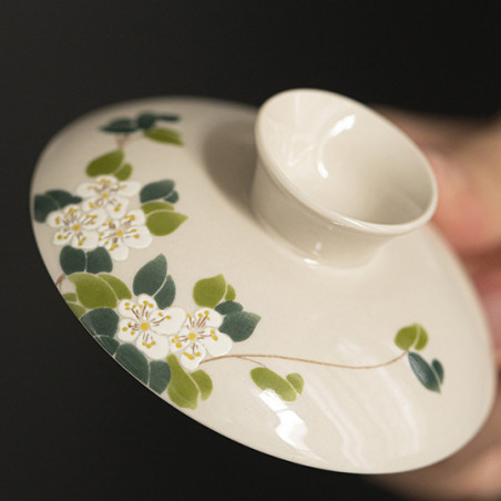 Витончена гайвань із зображенням квітів чаю. Цей мотив рідко зустрічається в оформленні посуду, хоча, безперечно, доречний на чайному столі.