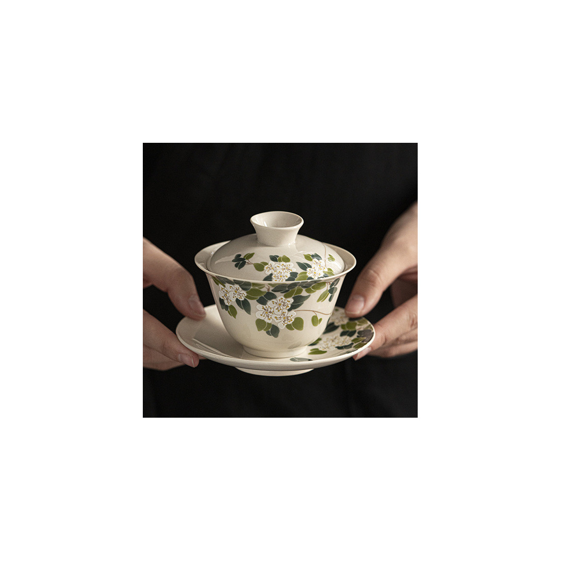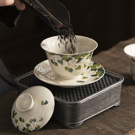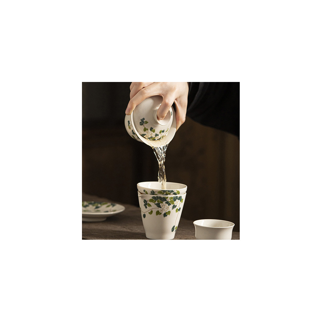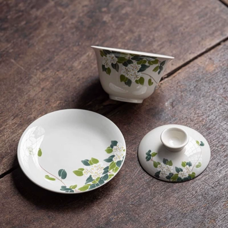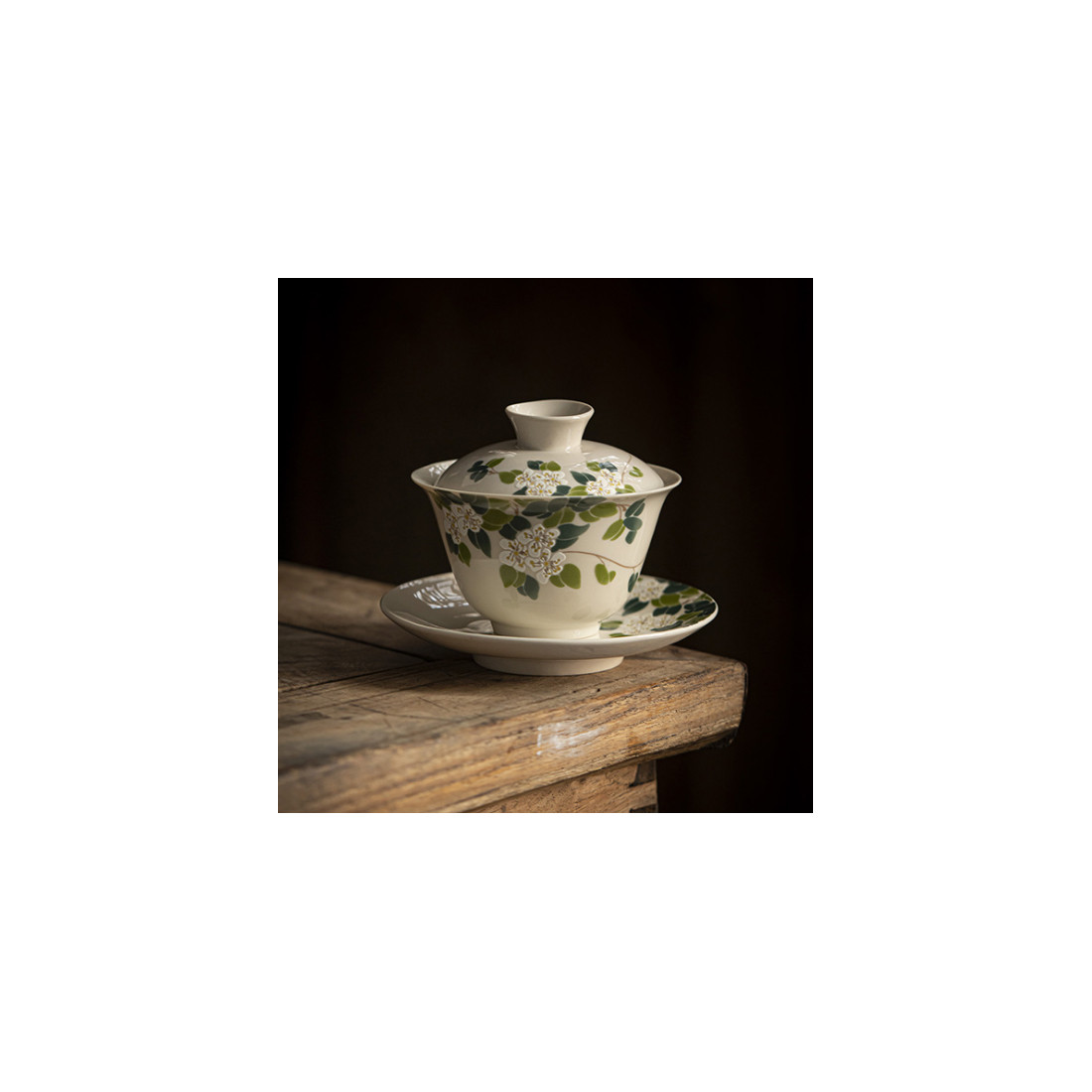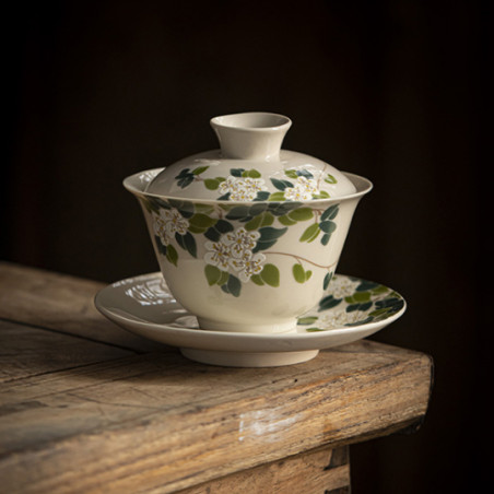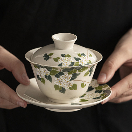 Витончена ґайвань із зображенням квітів чаю. Цей мотив рідко зустрічається в оформленні посуду, хоча, безперечно, доречний на чайному столі.