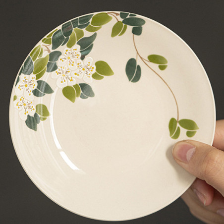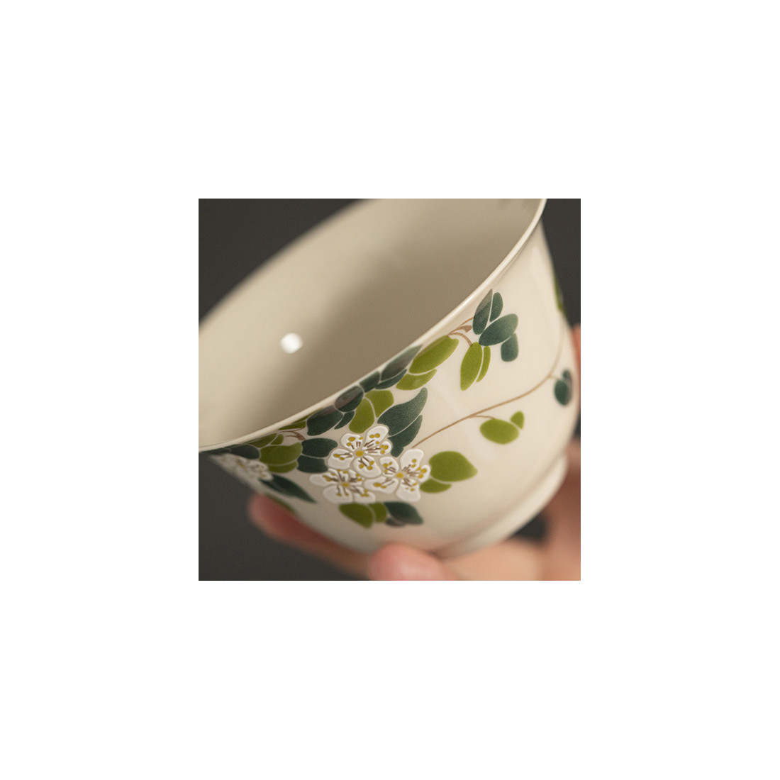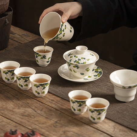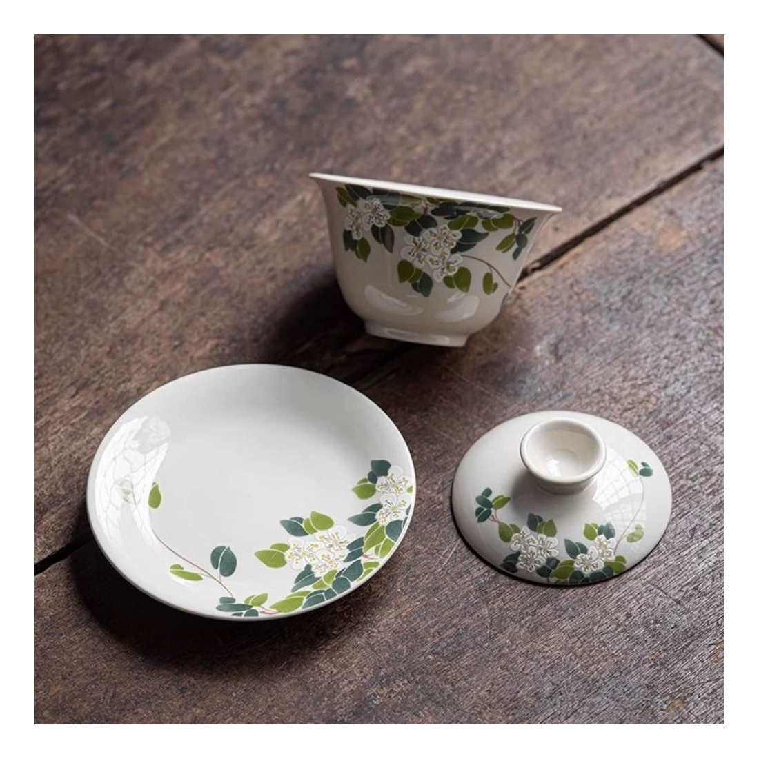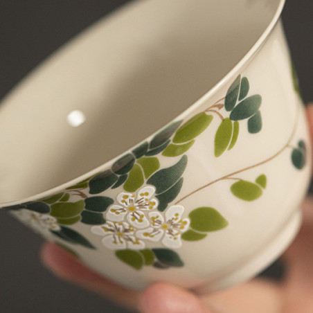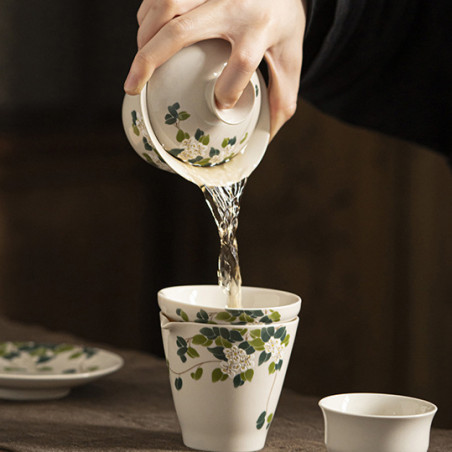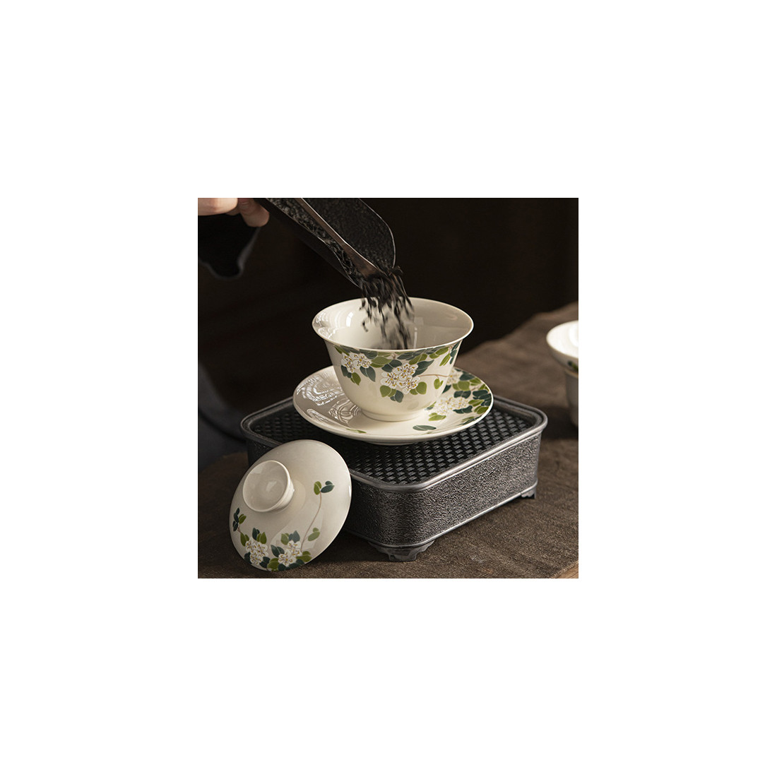 Витончена ґайвань із зображенням квітів чаю. Цей мотив рідко зустрічається в оформленні посуду, хоча, безперечно, доречний на чайному столі.