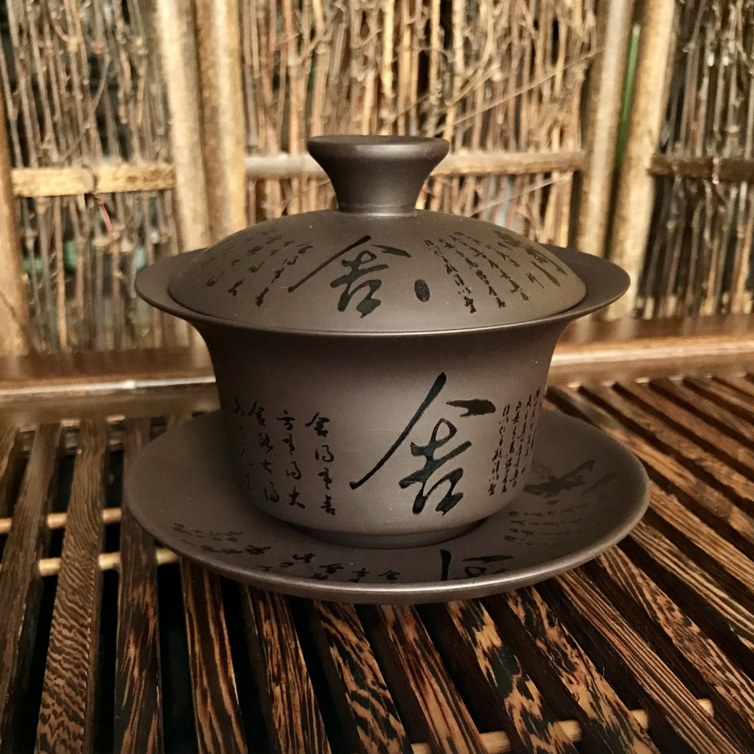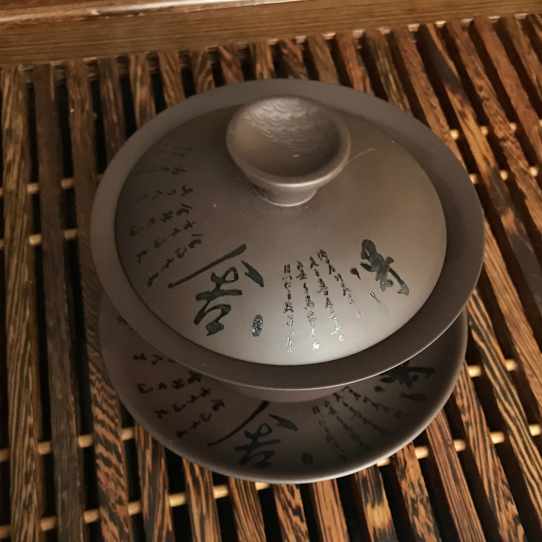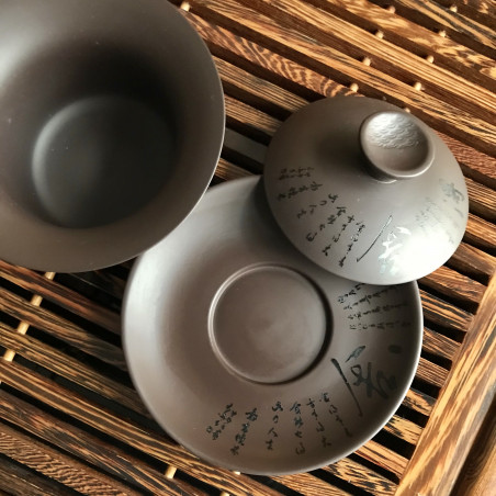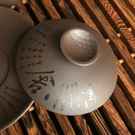 Гайвань із глини. Чудово підійде для заварювання багатьох чаїв, яким потрібна більш висока температура, ніж може зберігати порцеляна. На глину нанесено аплікацію - китайський вірш.