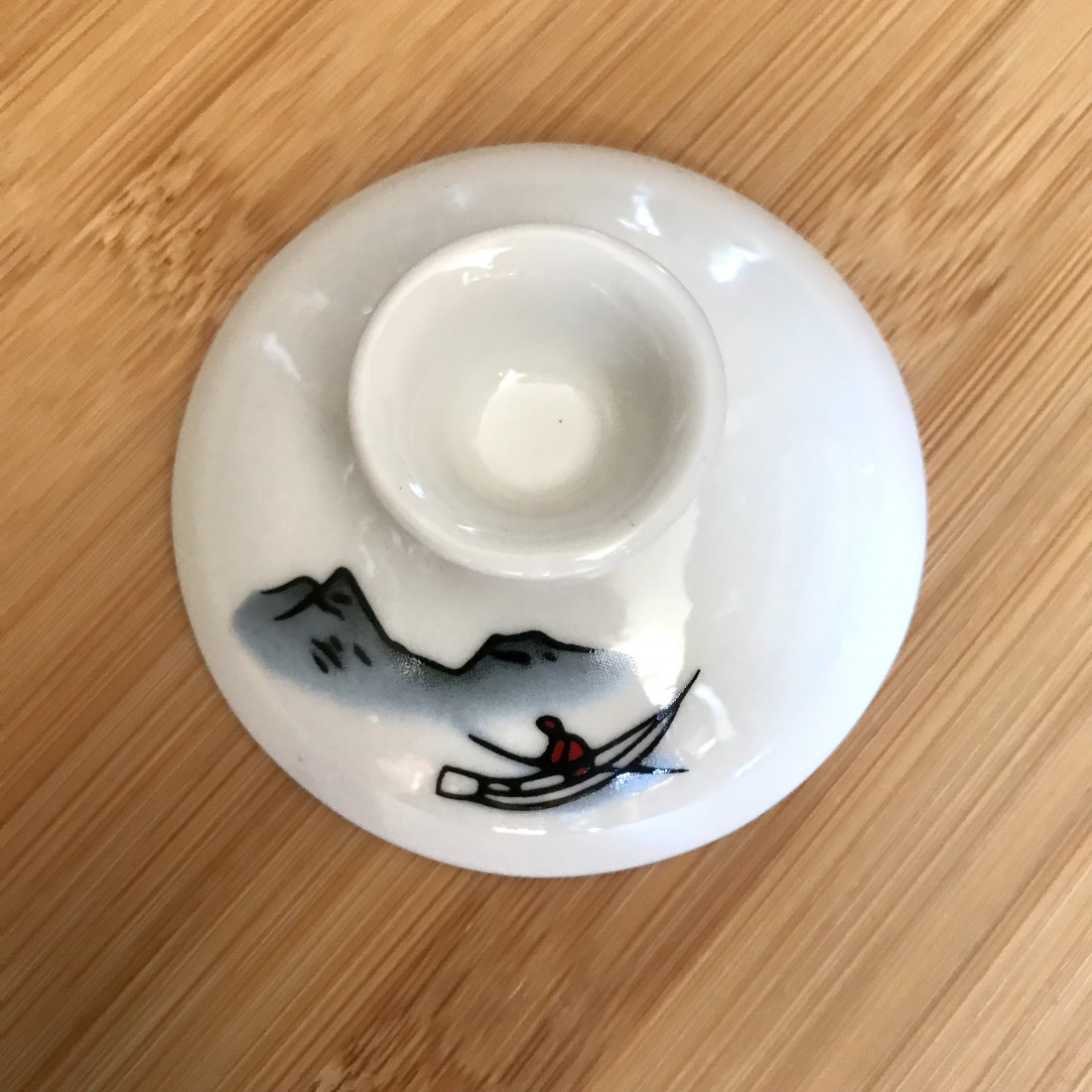 Біла кришка від маленької гайвані з малюнком, діаметр – 8 см.