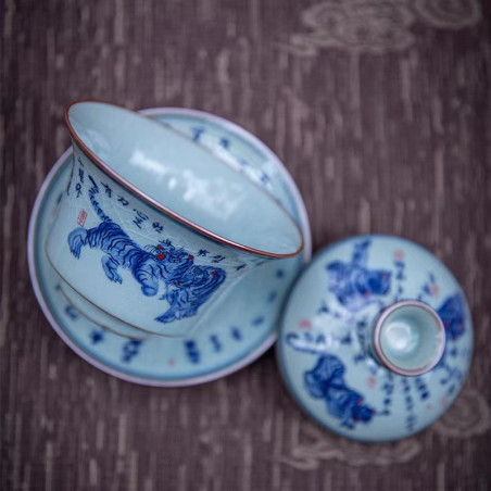 Гайвань з порцеляни Цзінхуа старої глини. Це старовинна техніка виробництва порцеляни. Взагалі, порцеляна Цзінхуа — це вироби з підглазурними малюнками кобальтом, який при випаленні набуває синього кольору. Зазвичай це синьо-білі вироби, але термін "стара глина" передбачає, що порцеляна сірого відтінку. Крім того, при випалюванні на поверхні глазурі утворюються тріщини, які згодом зафарбуються чаєм і стануть ще більш явними. На дні гайвані написано ієрогліф "тигр".