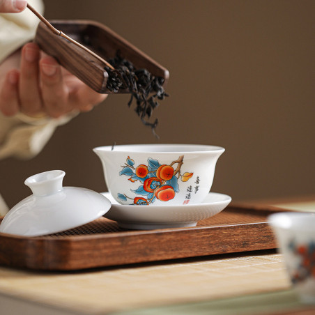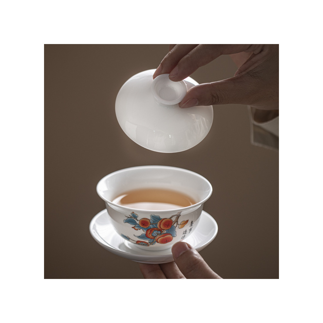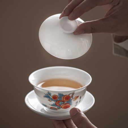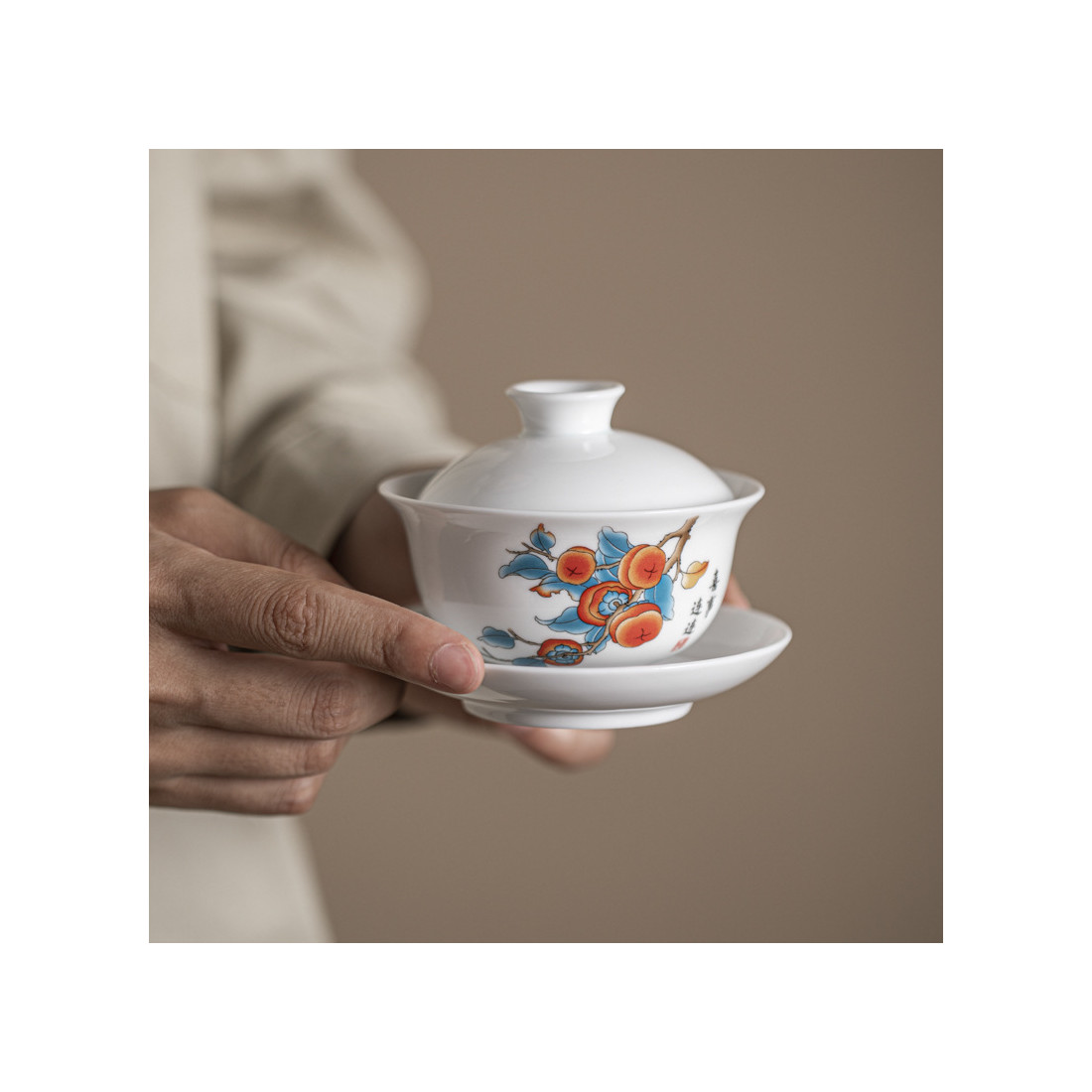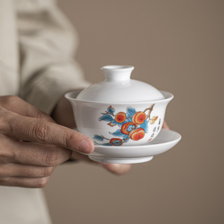 Гайвань із зображенням гілки хурми. Виконана з тонкостінної порцеляни з нанесенням аплікації.