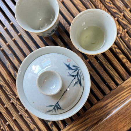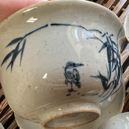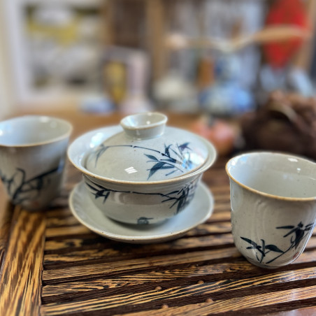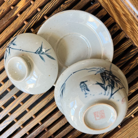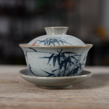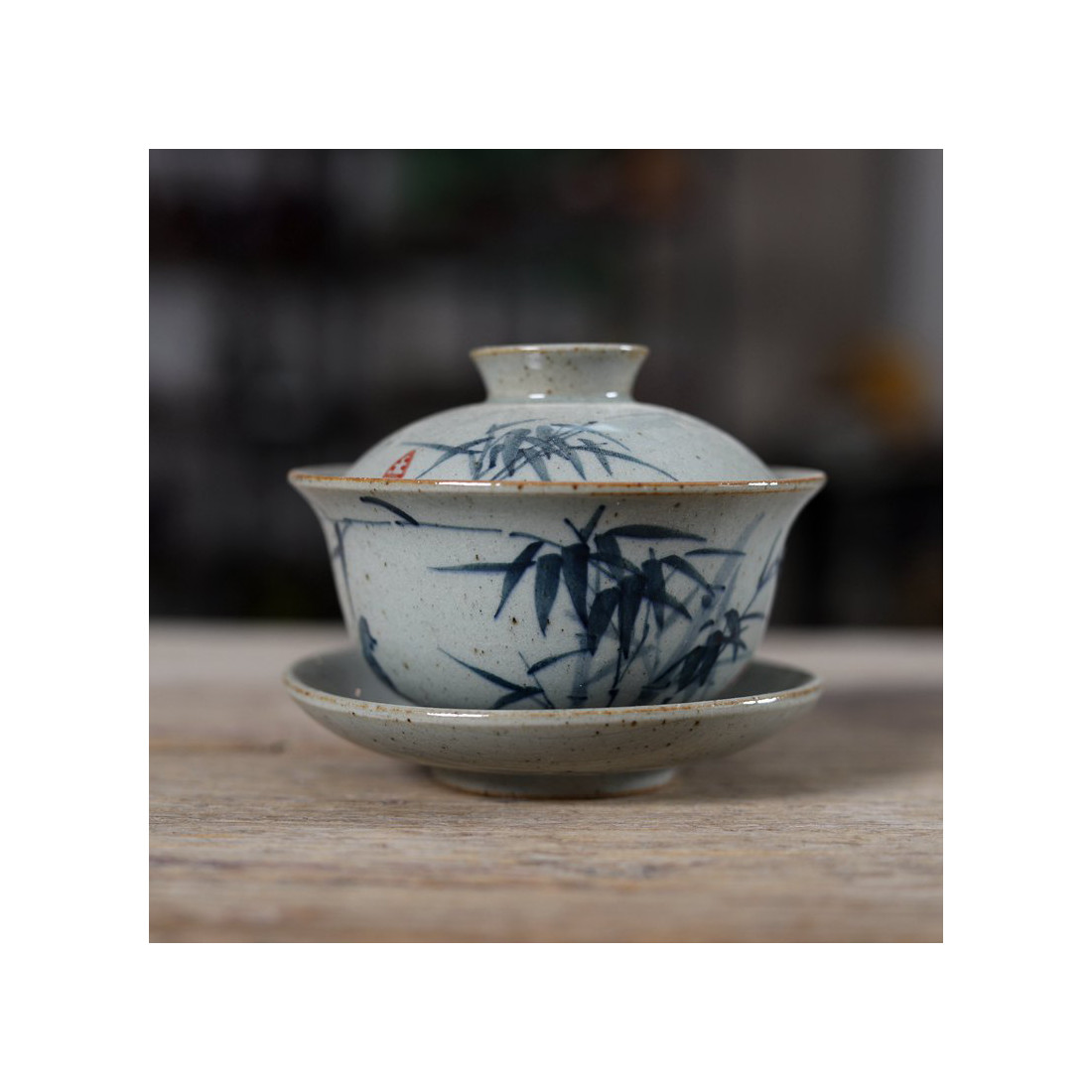 Ґайвань із сірої кераміки. За старих часів керамічне борошно не просіювали, тому на поверхні виробів залишалися різнокольорові вкраплення. Малюнок наносили кобальтом, який при випалюванні набував відтінку від блакитного до насичено-синього. Ліплення було ручним, тому і форма виробів могла бути неідеальною.