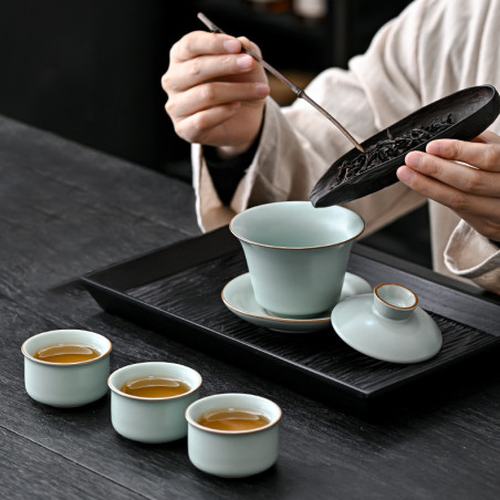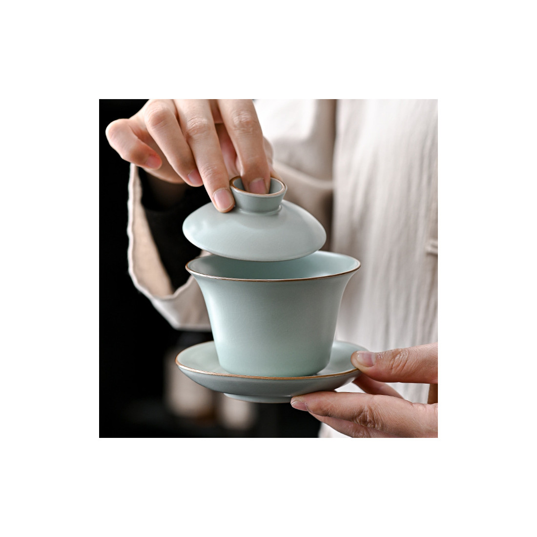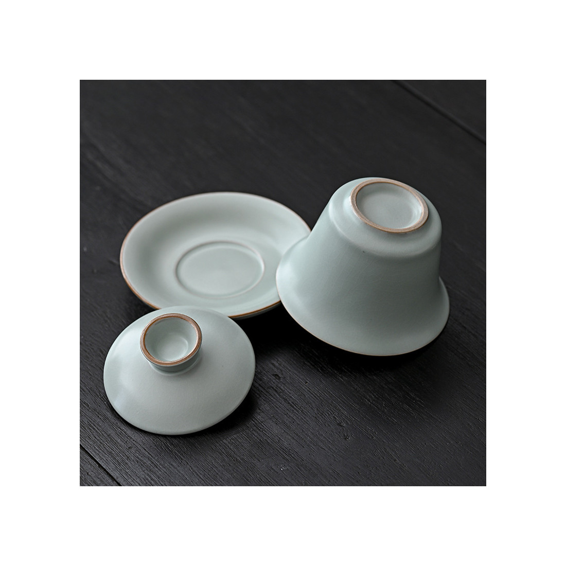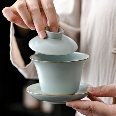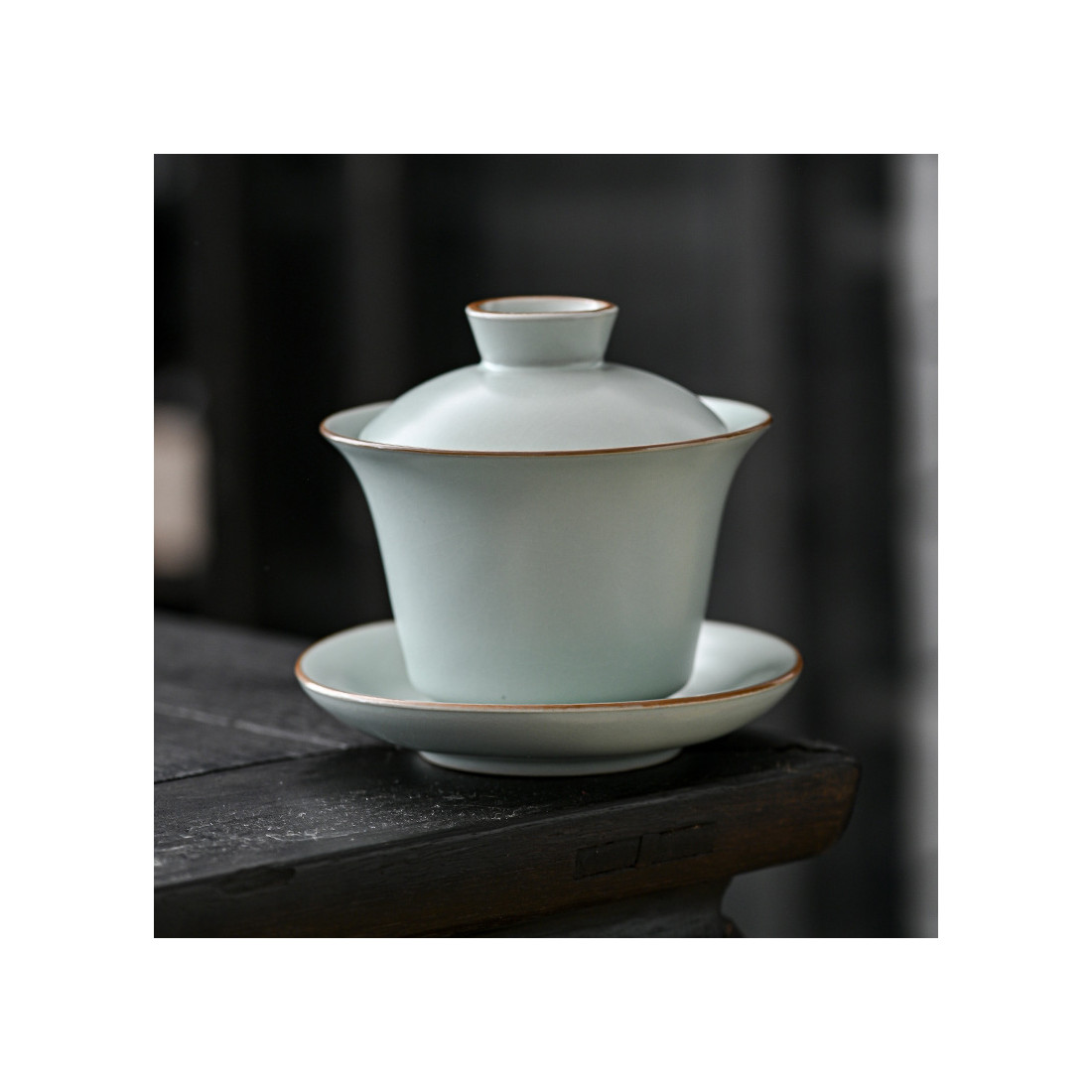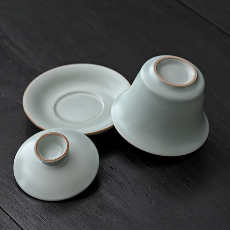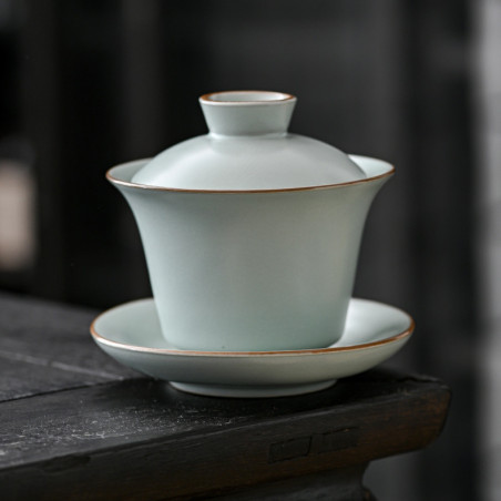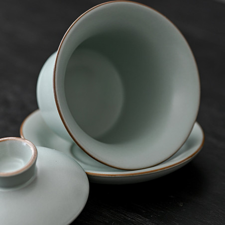 Найкрасивіша ґайвань із товстостінної кераміки жуяо сіро-блакитного кольору. Виготовлена традиційно: глибокий матовий колір, коричневі борти, проглядається "крокелюр", який згодом (від контакту з чаєм) промальовується і стане явним.