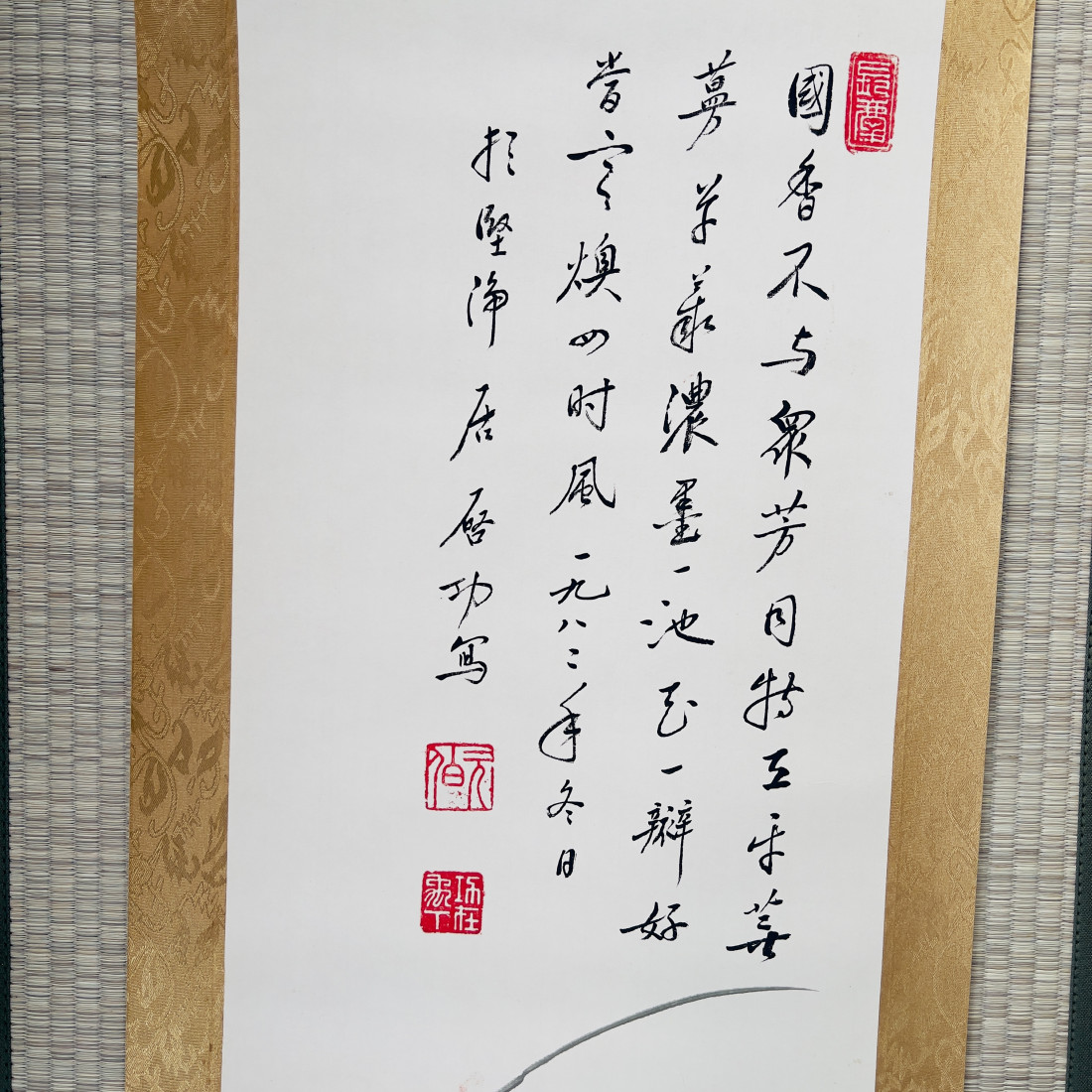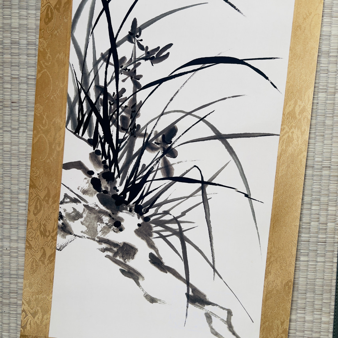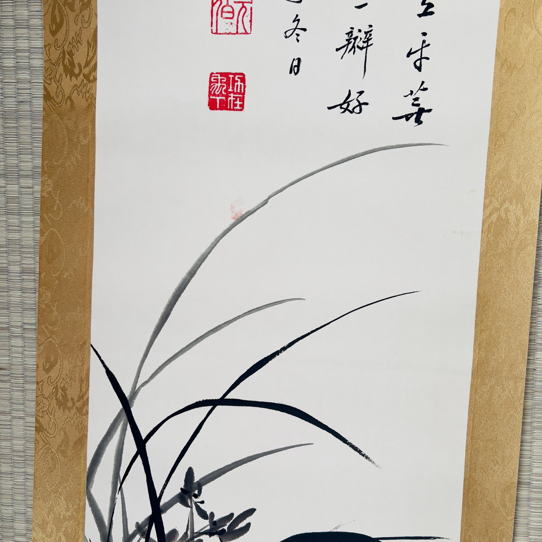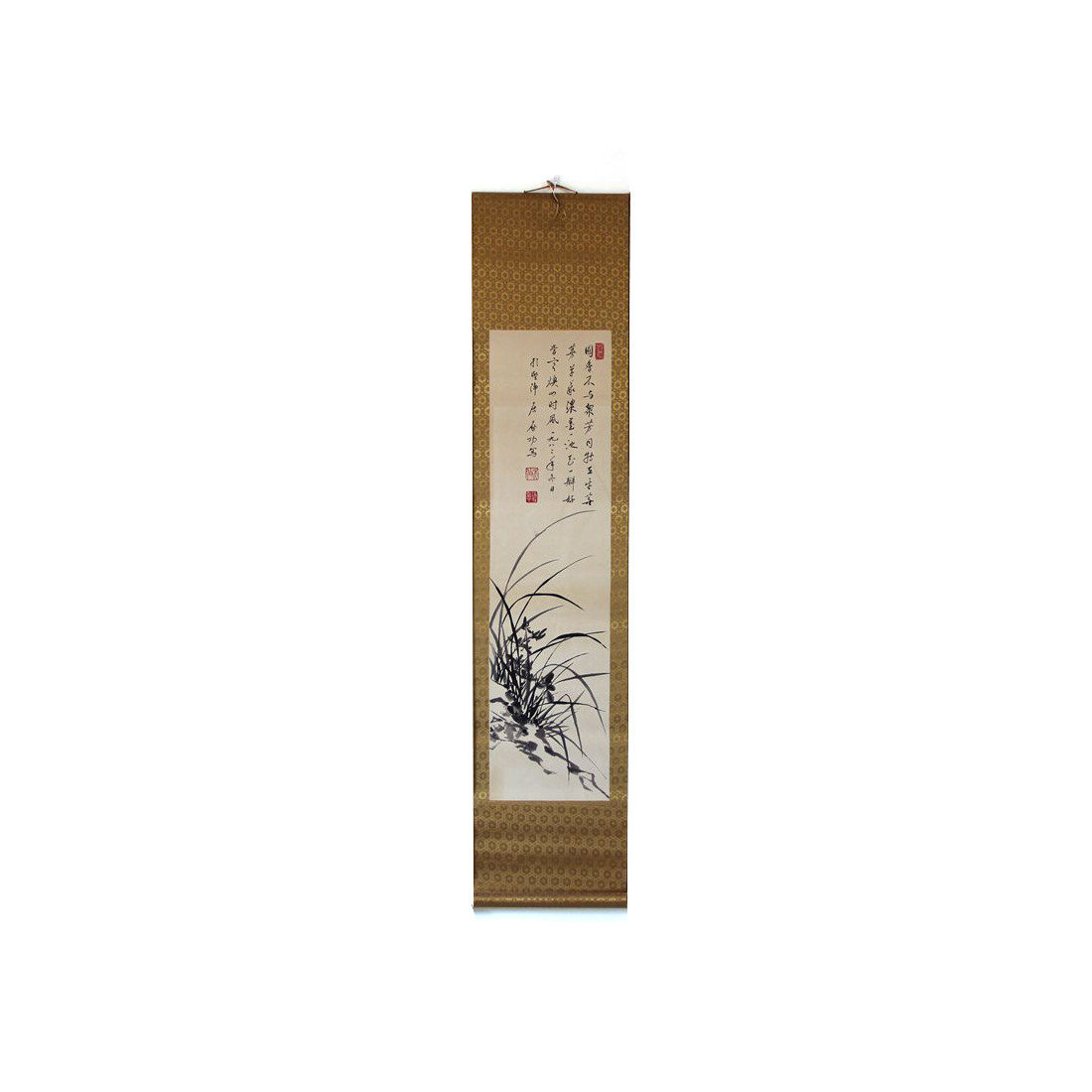 Сувій з репродукцією картини із зображенням орхідеї та чудовою каліграфією.