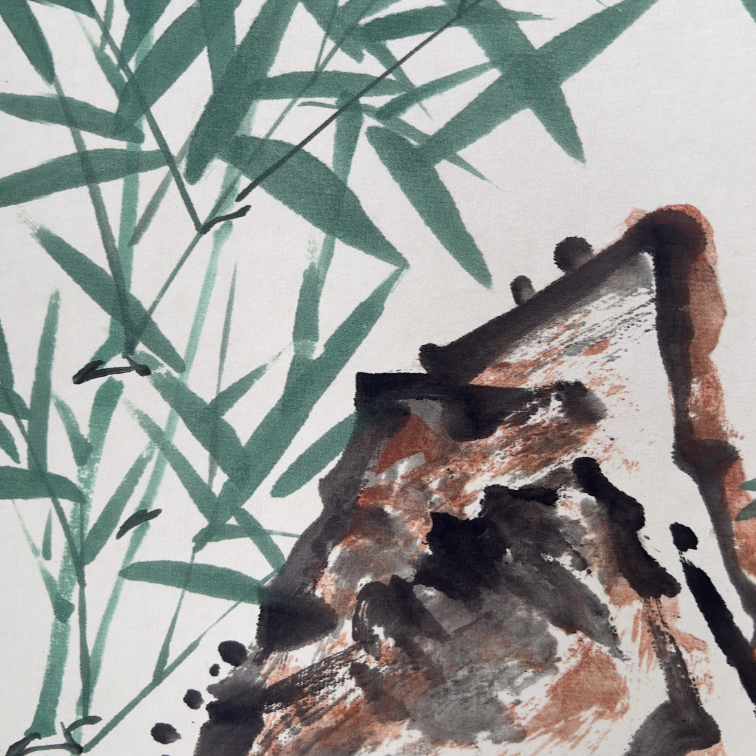 Бамбук уособлює літній період. Центральна фраза каліграфії "Бамбук росте сердито" не просто супроводжує зображення — вона пронизана глибоким філософським підтекстом. Цей вираз метафорично втілює образ неприборканого зростання: навіть під ударами вітру та дощу, бамбук стрімко тягнеться вгору, демонструючи внутрішню рішучість та непохитну силу. У літературній та філософській традиції такий образ служить алегорією стійкості, внутрішньої напруги та духу, який не згинається ні перед якими обставинами.