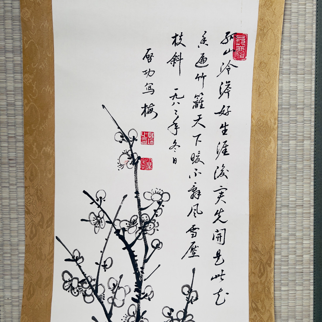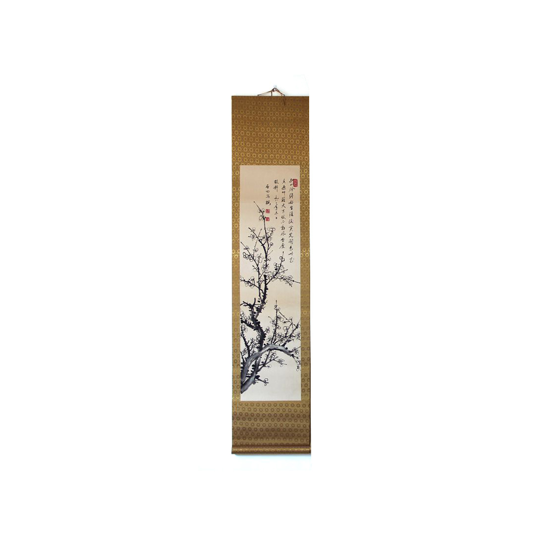 Сувій з репродукцією картини із зображенням сніжної сливи та чудовою каліграфією.