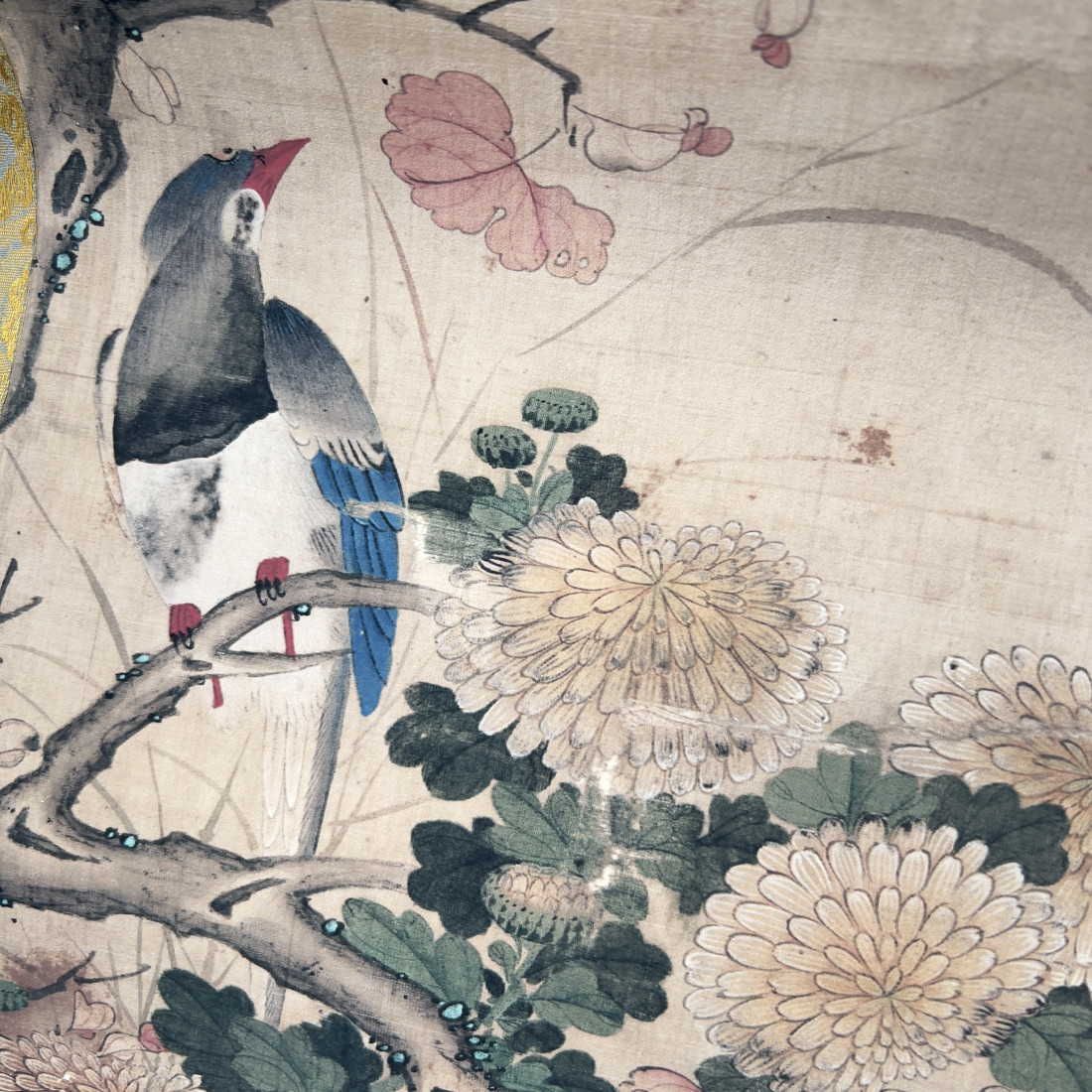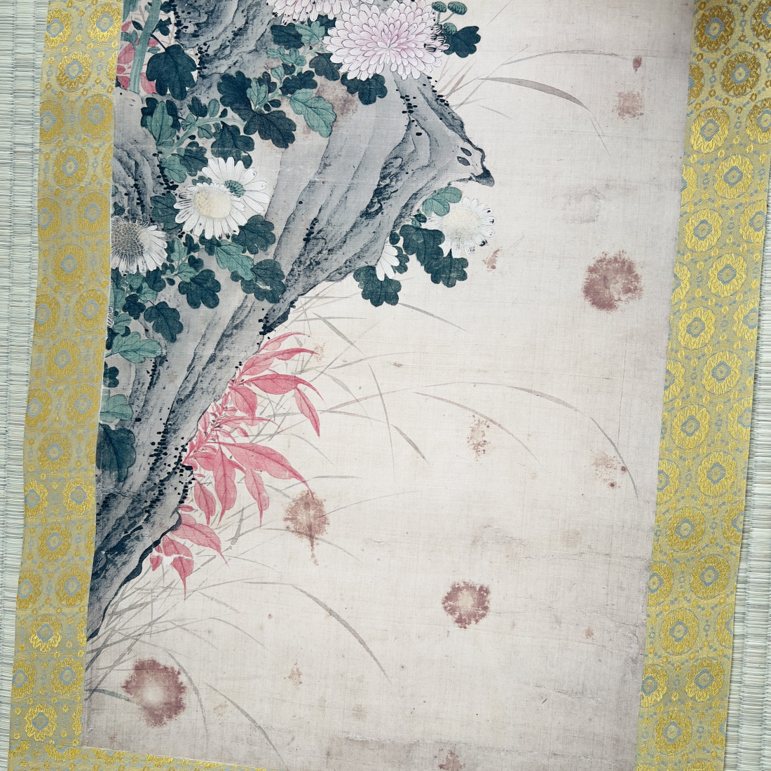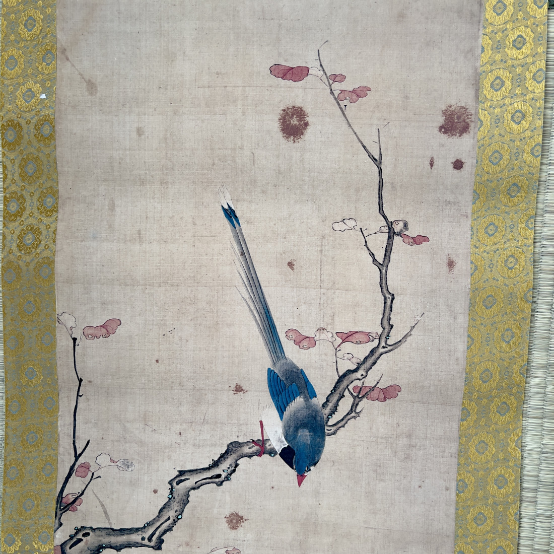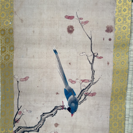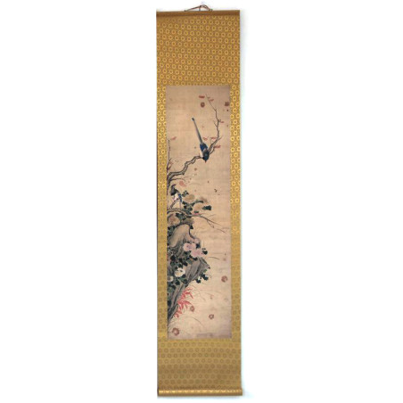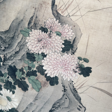 Сувій з репродукцією картини із зображенням птахів і хризантем в осінній пейзаж.