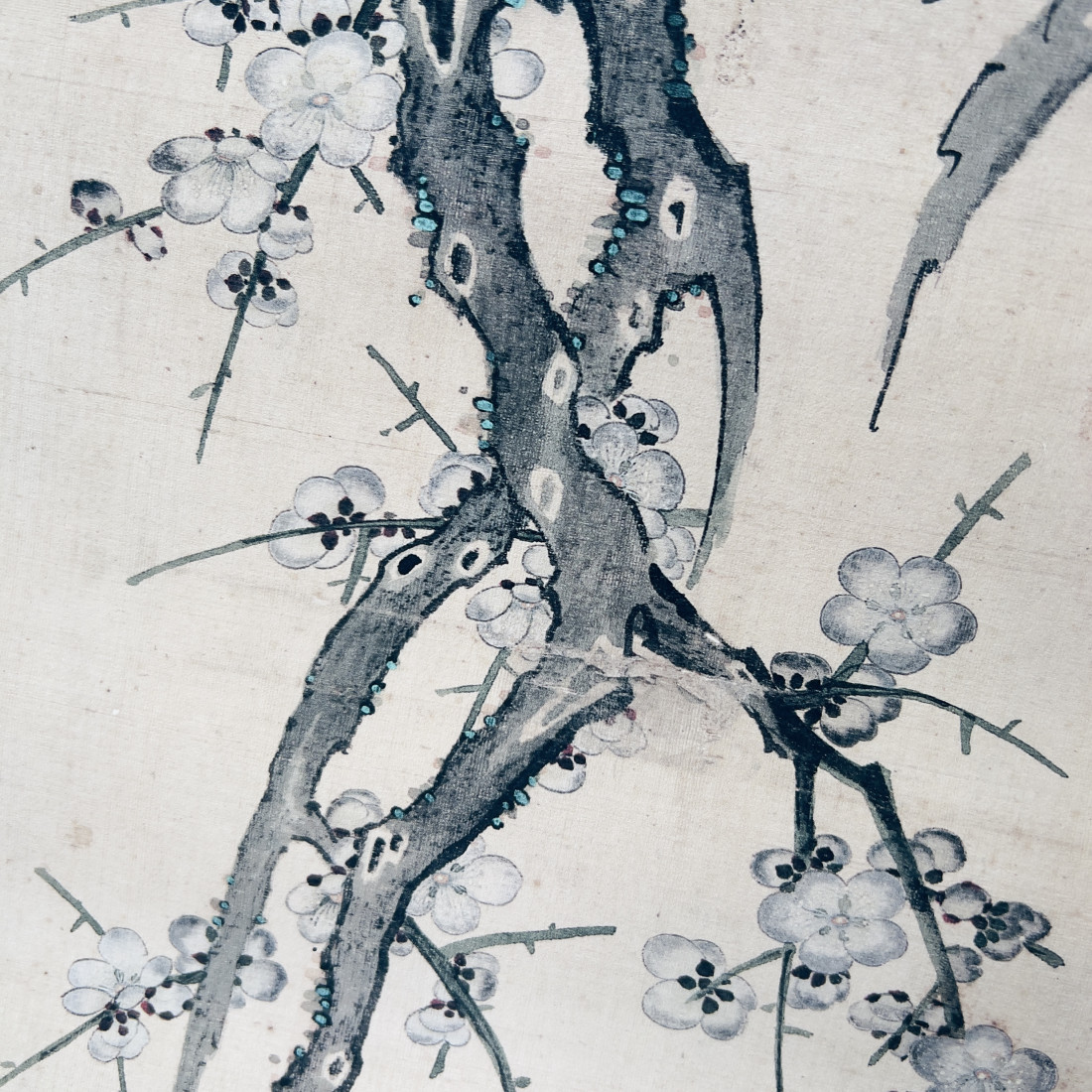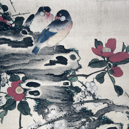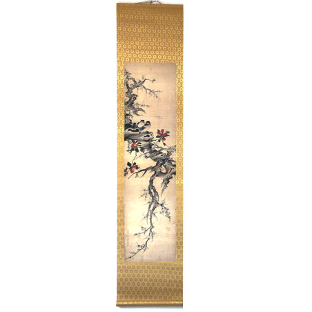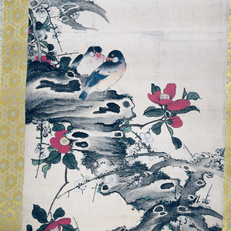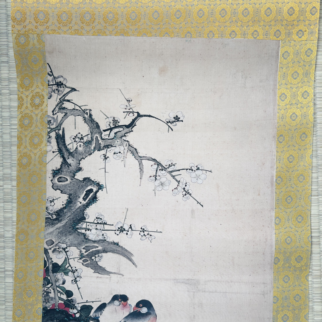 Сувій з репродукцією картини із зображенням птахів і сніжної сливи в зимовий пейзаж.