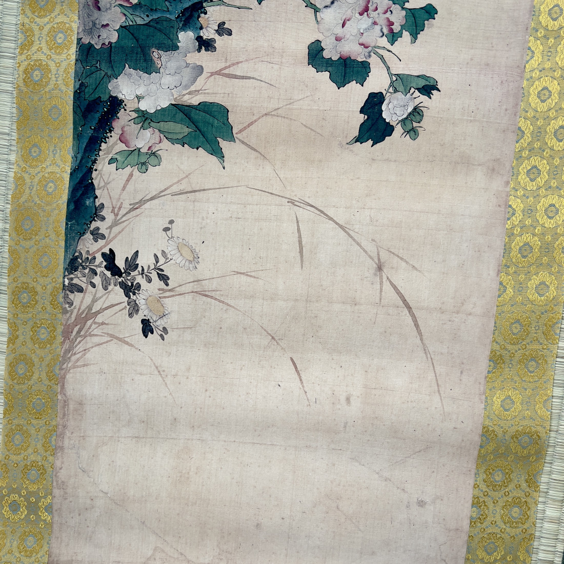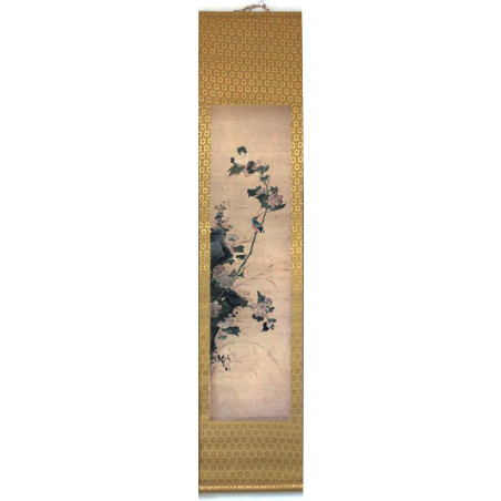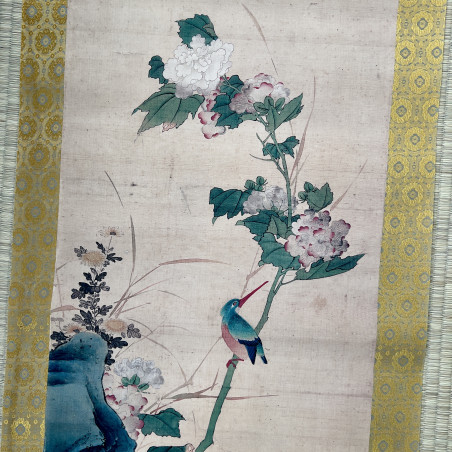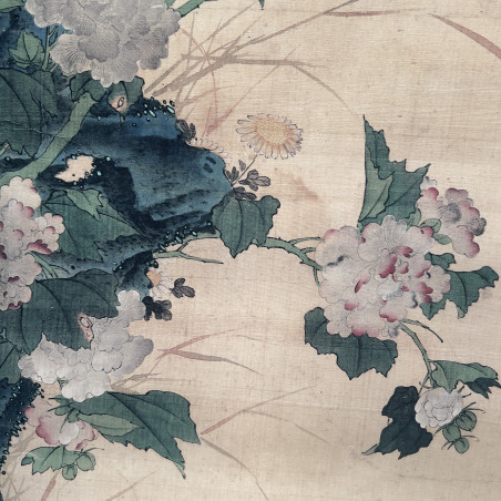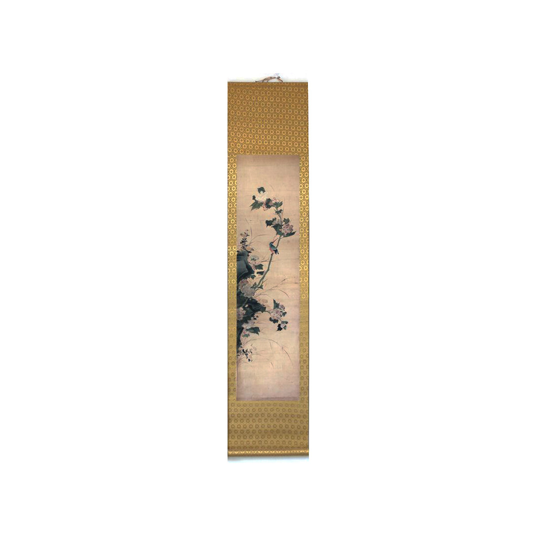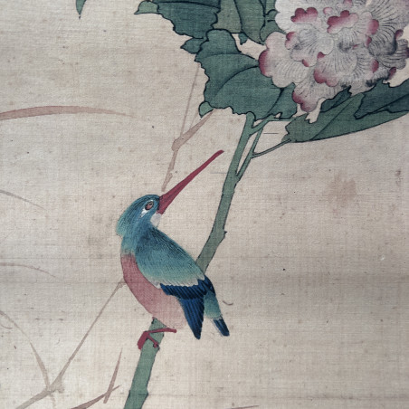 Сувій з репродукцією картини із зображенням птахів і півонії на весняний пейзаж.