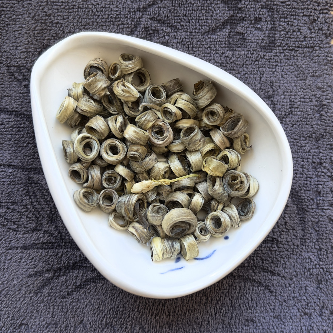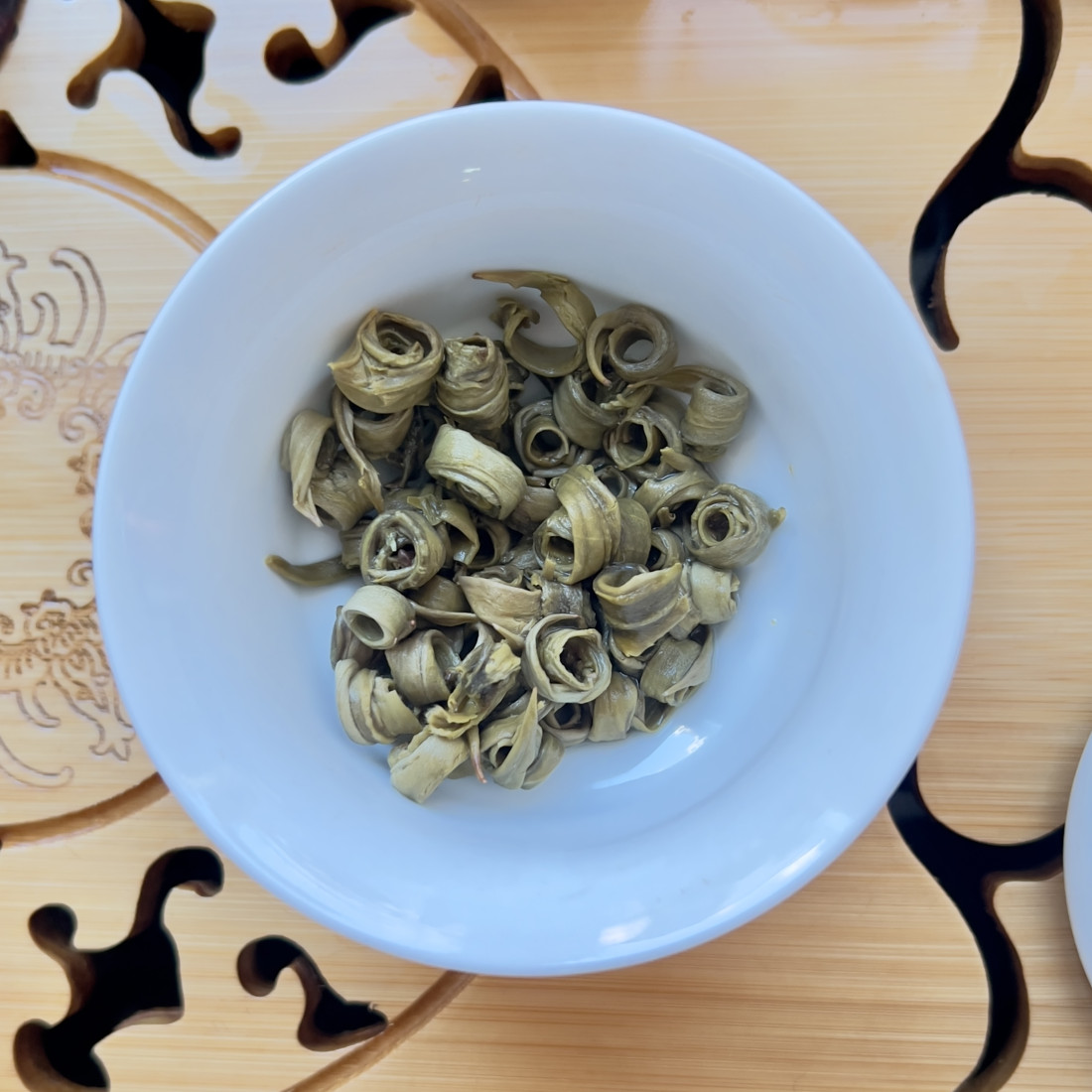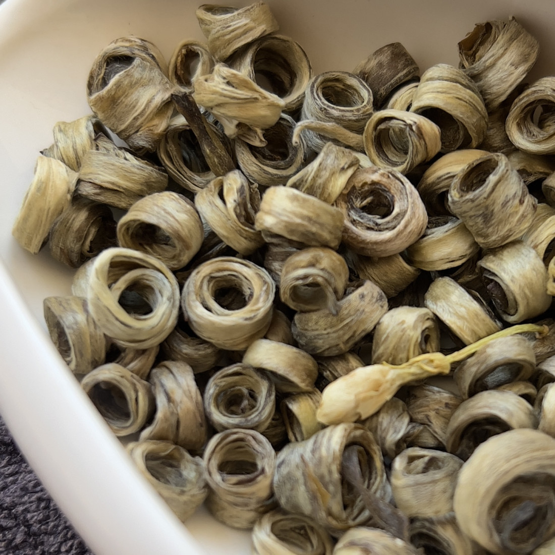 З'єднання найніжнішого зеленого чаю та ароматного жасмину народжує витончений жасминовий чай "Дівочі кільця". Намотуючи свіже листя на тонкі палички вручну, набувають форми, що нагадує сережки або кільця. Чай зав'ялюється, пропарюється і на завершальному етапі прожарюється.