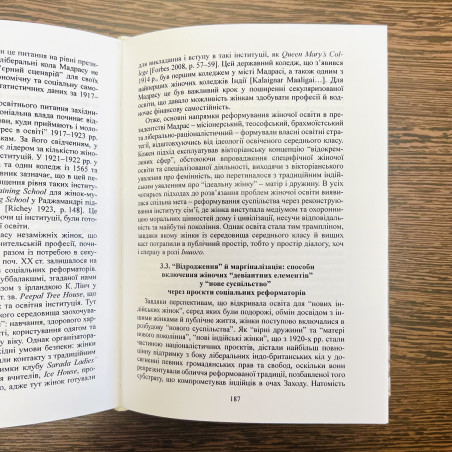 До уваги читача пропонується дослідження руху за соціальні реформи у президентстві Мадрас – адміністративній області, що поєднала більшу частину Південної Індії в епоху британського правління. У монографії досліджуються умови виникнення та формування, характер та основні напрямки реформістського руху “Південного президентства” з урахуванням особливої ролі південноіндійських освічених еліт як основних ініціаторів суспільно-політичних змін регіону. Формування руху за соціальні реформи розглядається у зв’язку з регіональним відродженням (ренесансом дравідської культури), а також зародженням націоналістичної свідомості в Південній Індії, враховуючи вплив як популярних у загальноіндійському масштабі націоналістичних концепцій (що надходили в Мадрас переважно з Бенґалії та Бомбею), так і регіональних ідей. Особливе місце в роботі відведено “жіночому питанню”, що було наріжним у реформістському процесі Мадраського президентства. Книга розрахована на наукових працівників, викладачів, студентів, широке коло читачів, які цікавляться історією Індії, колоніальною епохою, а також дослідженнями в галузі гендерної історії.