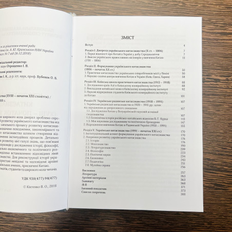 У книзі на основі дослідження широкого кола джерел зроблено спробу реконструкції й аналізу історії розвитку українського китаєзнавства від зародження дотепер як частини загального процесу розвитку китаєзнавства у Східній Європі. У праці визначено походження, закономірності та напрямки розвитку українського китаєзнавства шляхом створення відповідної біобібліографії та визначення інституційних процесів. Детально проаналізовано основні напрямки розвитку цієї галузі знань, що пов’язані із вивченням внеску українських науковців у дослідження історії, філософії, культури, мови, літератури, соціально-економічного та політичного розвитку Китаю. Особливу увагу приділено встановленню відповідних ліній наступності в українському китаєзнавстві. Для реконструкції історії українського китаєзнавства були використані невідомі та маловідомі архівні матеріали й наукові публікації українських вчених, присвячені Китаю. Для китаєзнавців, істориків, дипломатів, студентів та широкого кола читачів.