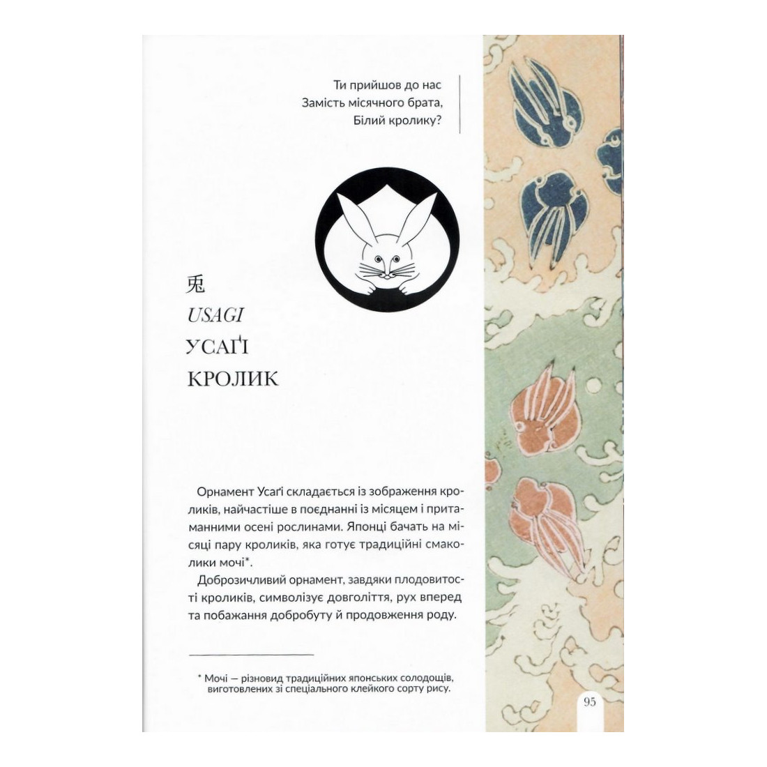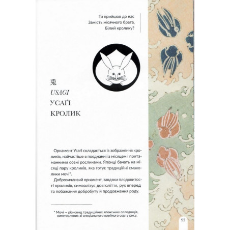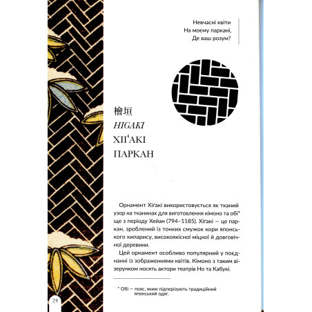 Вишукані тканини японських кімоно та символіка їх узорів мають поціновувачів у всьому світі. Захоплення величчю природи та замилування простими буденними речами пронизує всю японську культуру, і традиційна орнаментика є цьому доказом. У книзі представлено 88 орнаментів, які використовувалися для оздоблення тканин протягом багатьох століть і залишаються поширеними й донині. Їхню естетику підкреслюють яскраві ілюстрації та співзвучна поезії хайку.