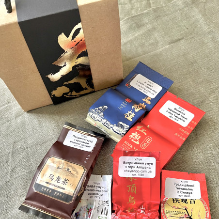 В Китаї виробляють особливий, надзвичайно ароматний чай – улун. Специфічна технологія обробки, заснована на природних властивостях чайного листя, дозволяє створювати різноманітні відтінки смаку та аромату. Існує 4 регіони вирощування чайних кущів, які підходять для виготовлення улунів: Північний Фуцзянь, Південний Фуцзянь, Ґуандун і о. Тайвань. У цих місцевостях роблять безліч різніх сортів улунів. Ми пропонуємо вам ознайомитися з їх різноманіттям та насолодитися смаком за допомогою нашого невеликого набору, до якого увійшли пробники по 7-8 грамів: