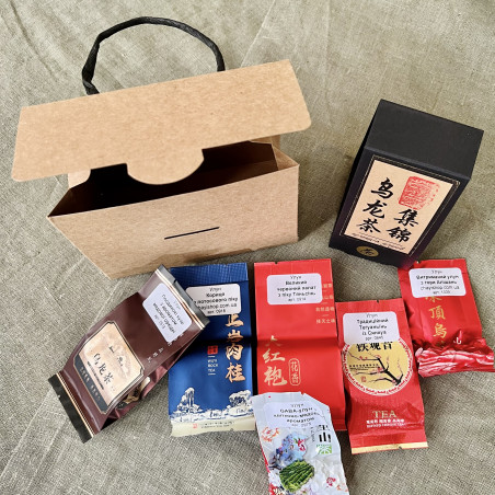 6 пробників + викладений вище роздрукований коментар до набору розміщується в крафтовій сумочці з ієрогліфом "чай" розміром 14*11*7 см.