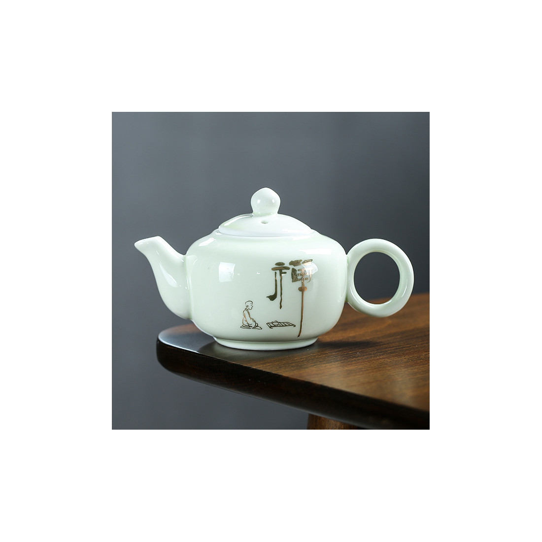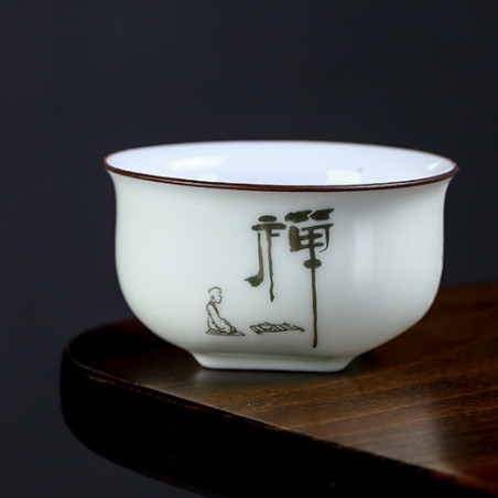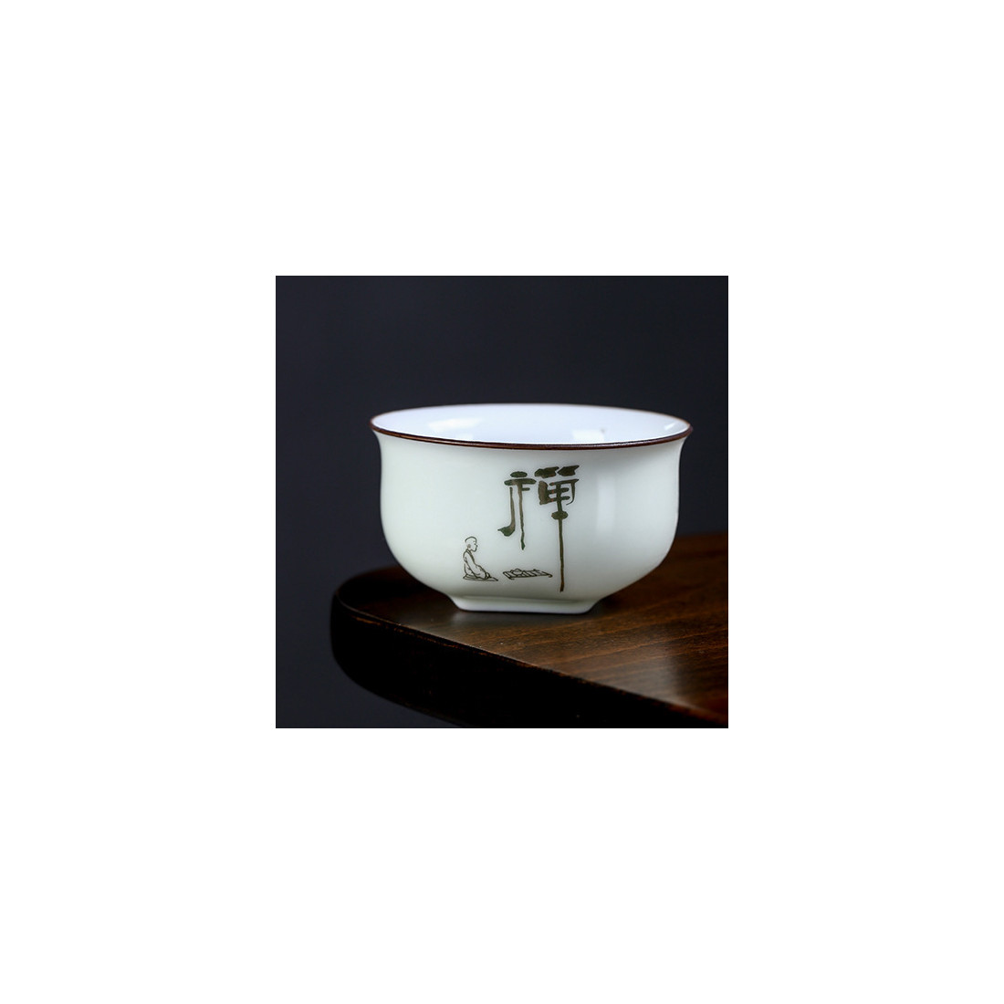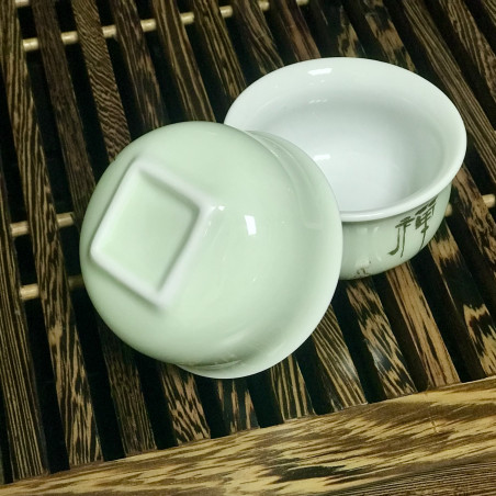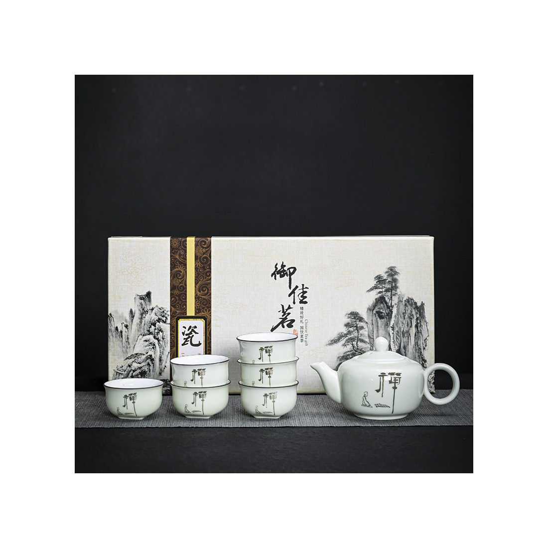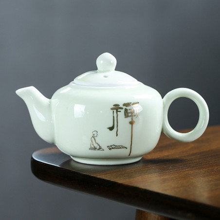 Набір посуду для чаювання з порцеляни з блакитним відтінком та золотим малюнком. На вироби нанесено зображення з ієрогліфом "Чань", більш відомим у японському звучанні "Дзен". Аналогія з фразою "У чаю та дзен один смак".