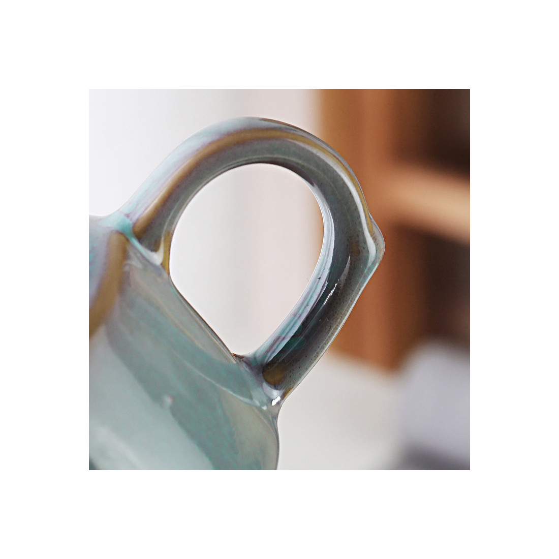 Набір посуду для чаювання з кераміки яобянь. Загальний колір глазурі блакитний з невеликими фіолетовими краями. Яобянь — означає, що підтікання і колір глазурі остаточно формується при випаленні, тому у кожного набору можуть бути свої невеликі нюанси в кольорі і фактурі глазурі.