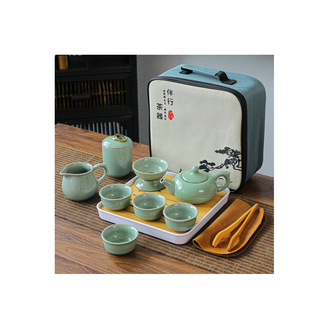 Набір кераміки ґеяо зеленого відтінку. У невеликій сумці міститься все, що необхідно для чаювання.