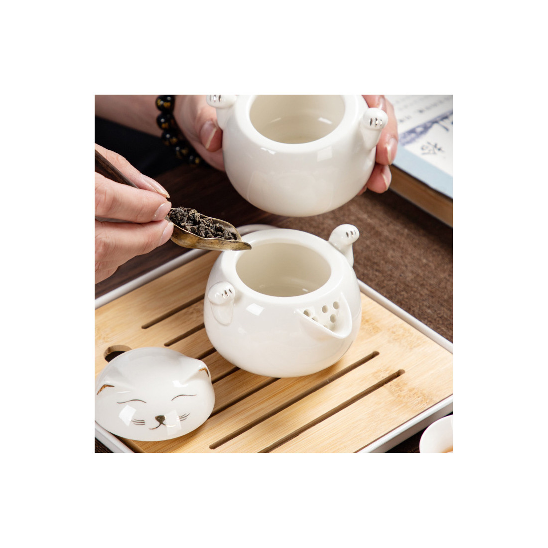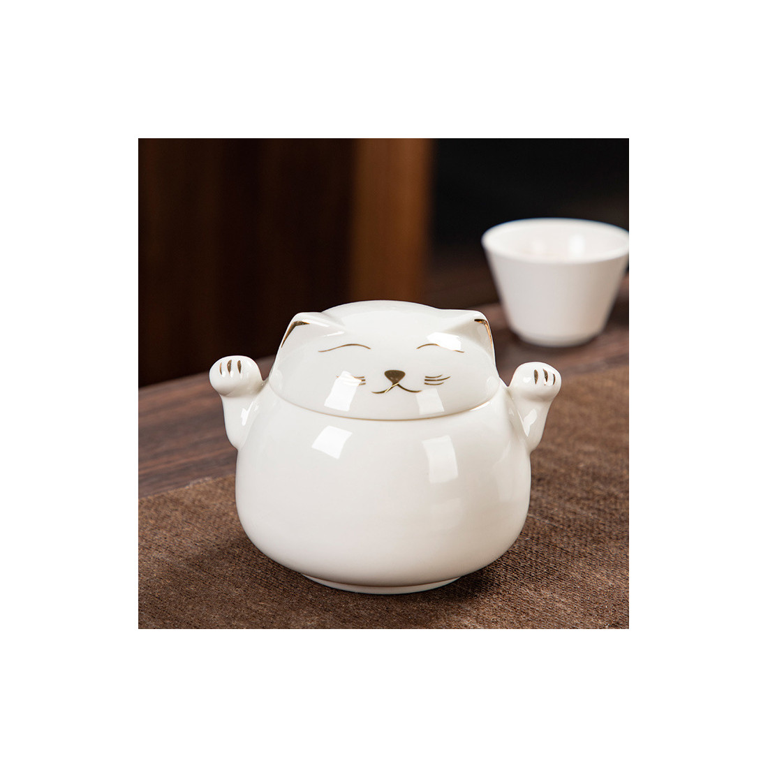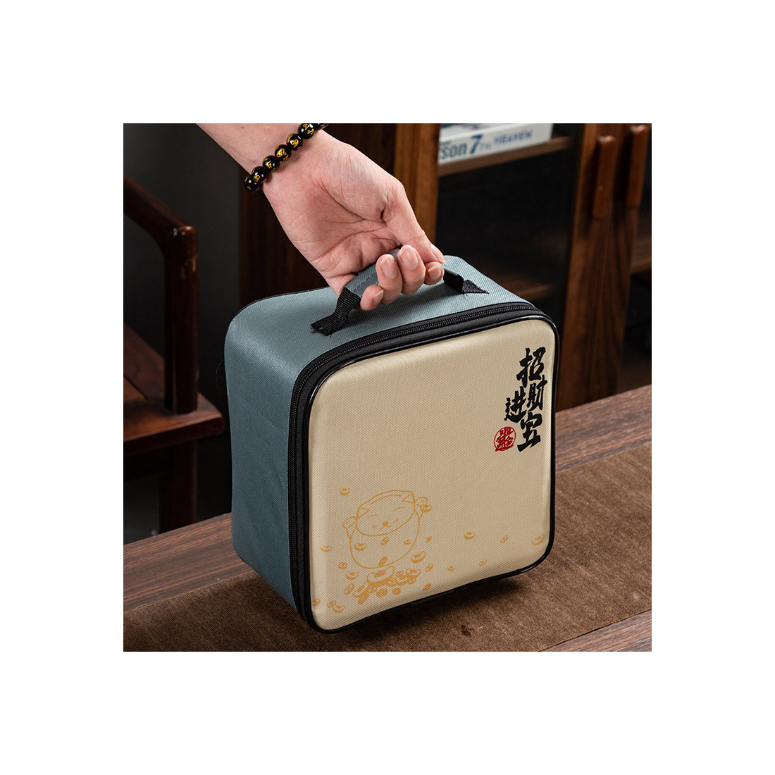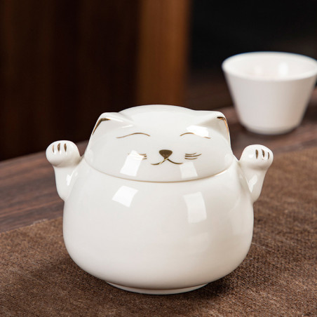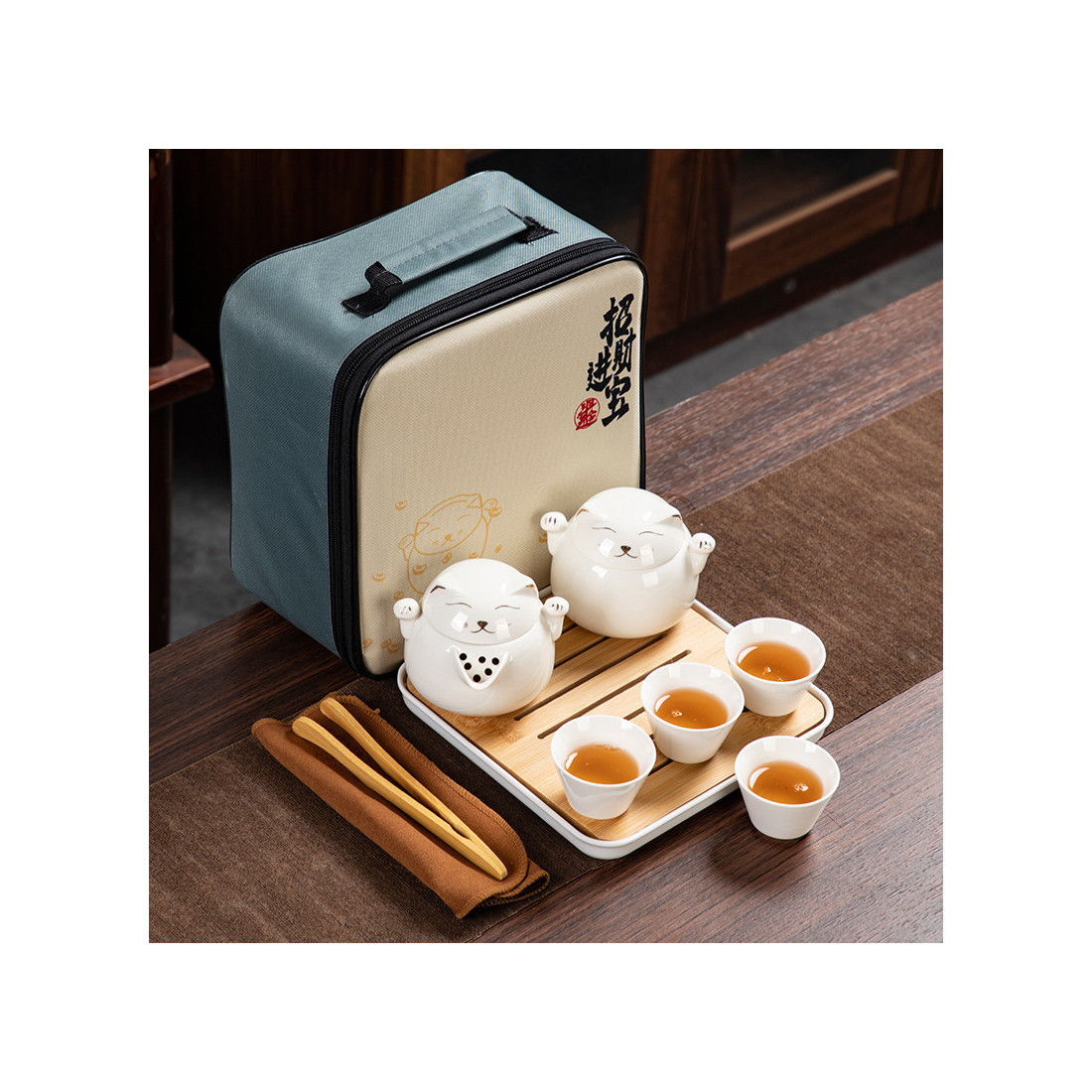 Керамічний набір для подорожей у сумці з чабанню. Чайник та чайниця в образі котика Манекі-неко.