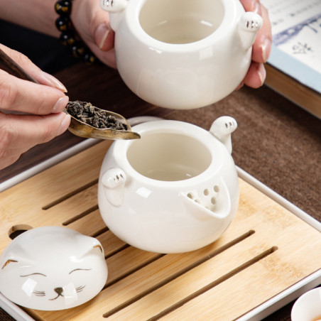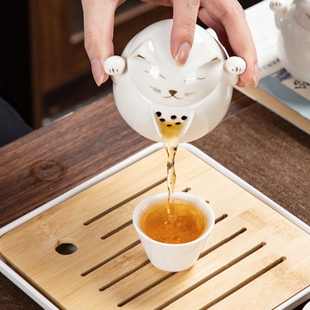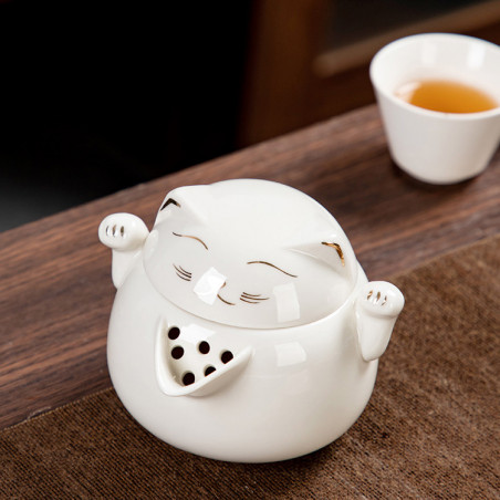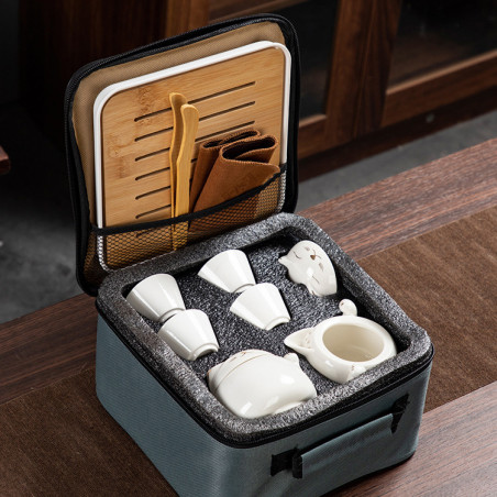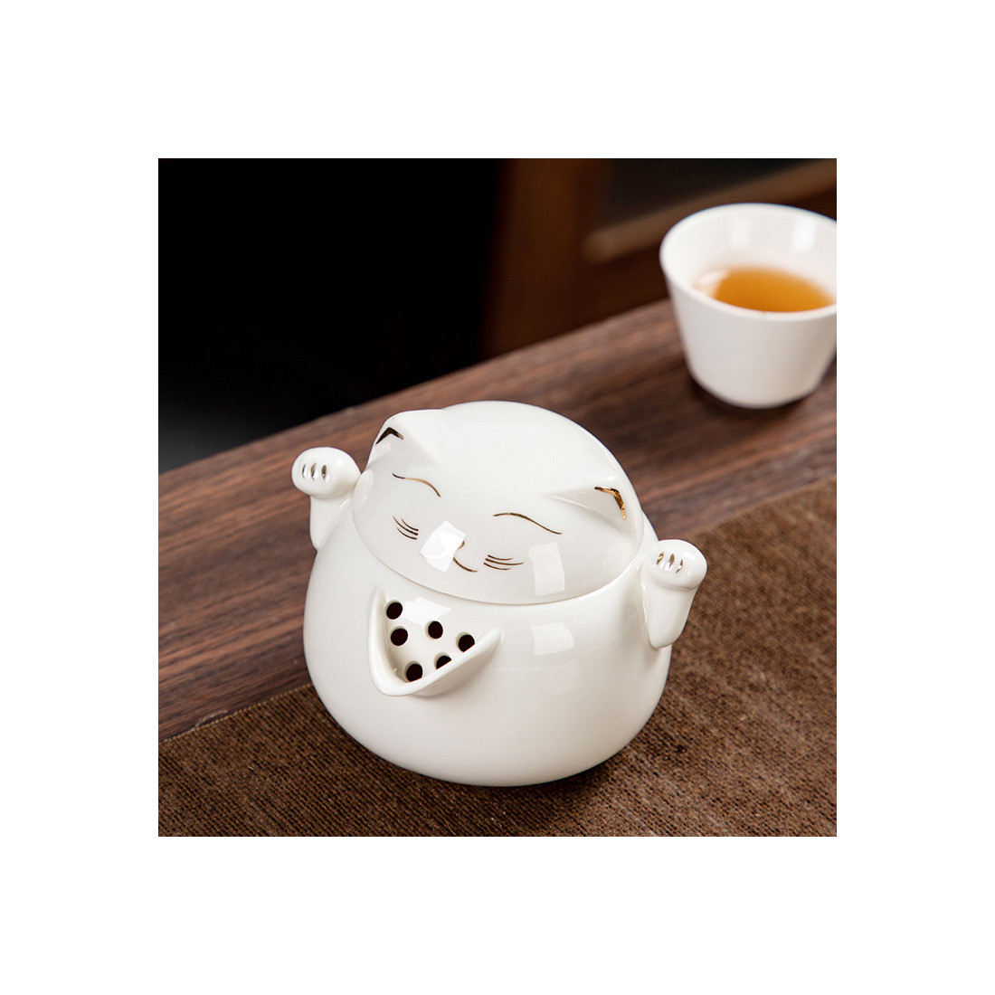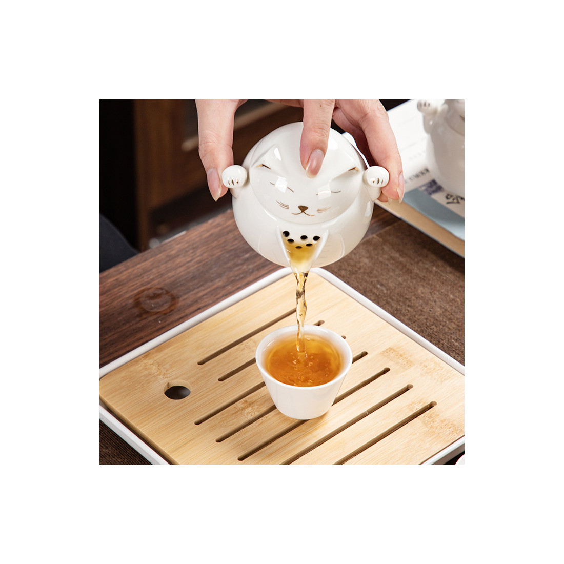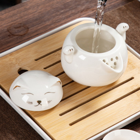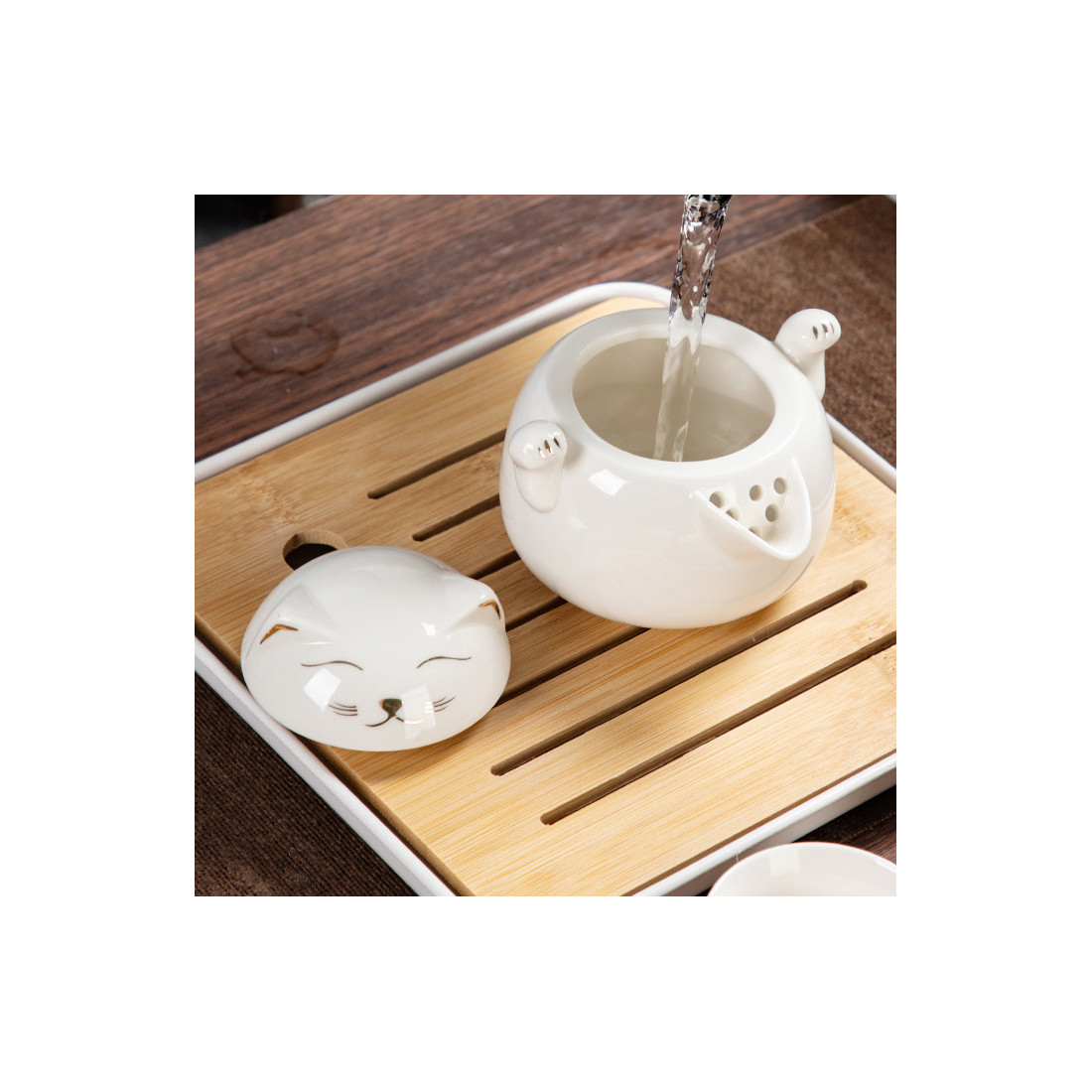 Керамічний набір для подорожей у сумці з чабанню. Чайник та чайниця в образі котика Манекі-неко.