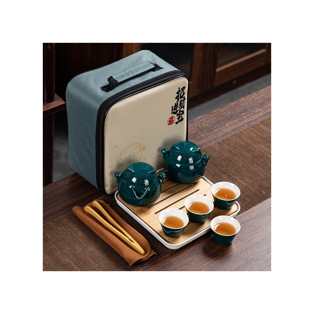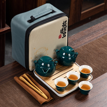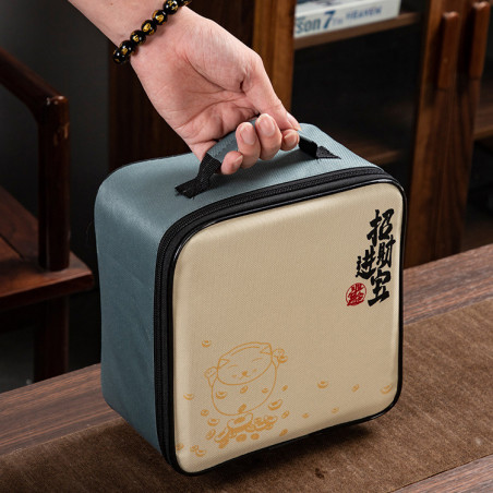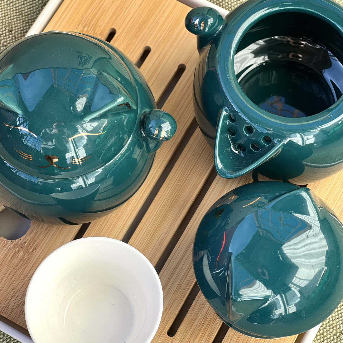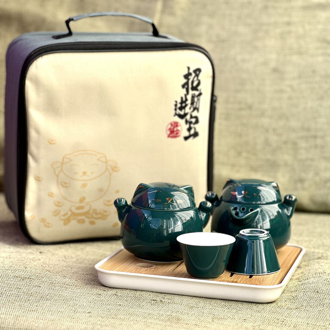 Керамічний набір для подорожей у сумці з чабанню. Чайник та чайниця в образі котика Манекі-неко.