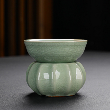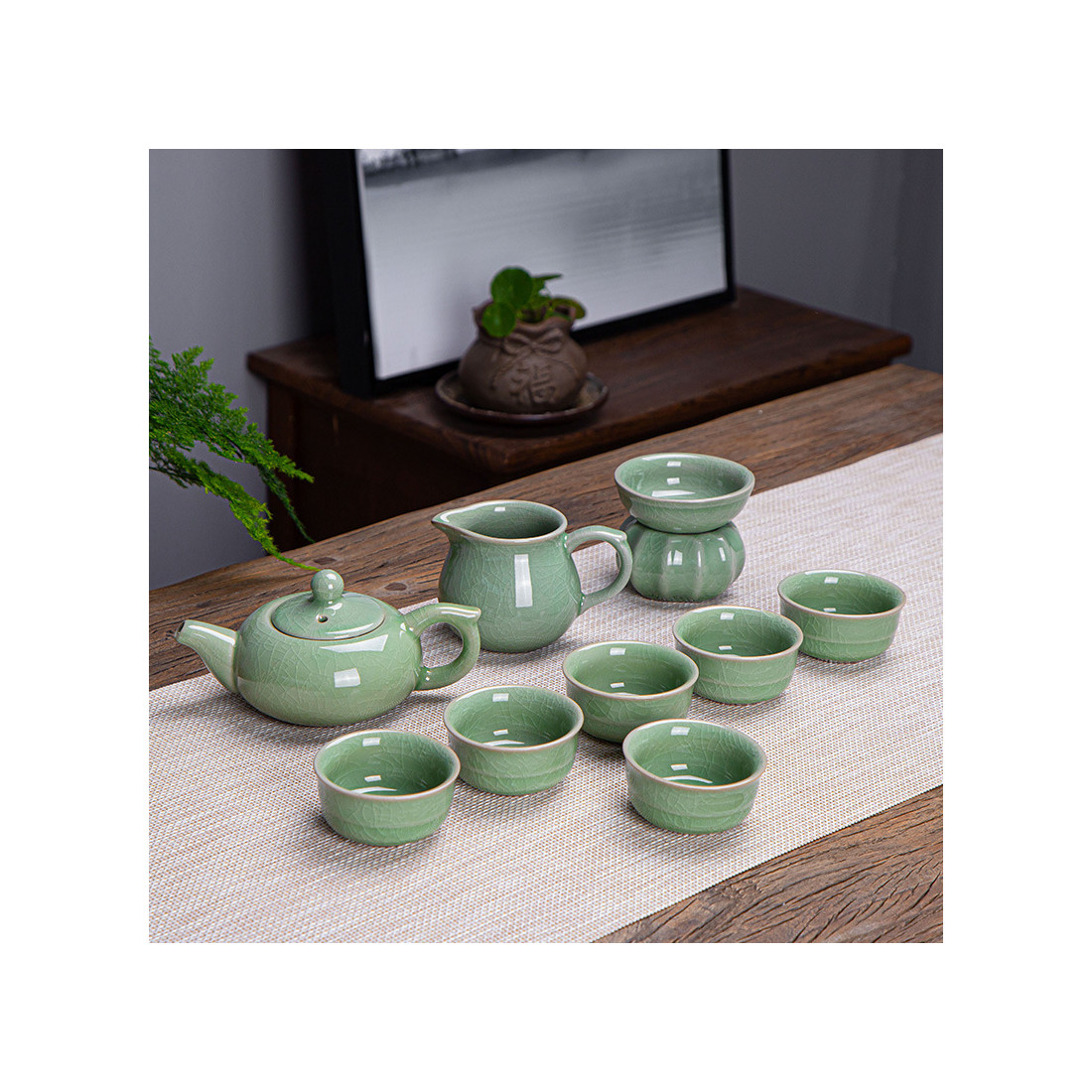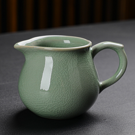 Керамічний набір із ґеяо кольору зеленої сливи. У посуді гарномічно поєднуються округла плавність та тонкі лінії. З часом прожилки на посуді профарбуються чаєм і набір стане ще кращим.