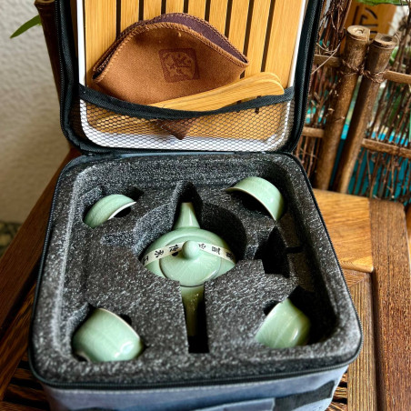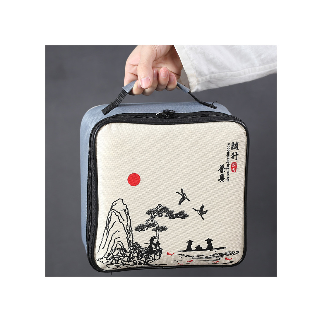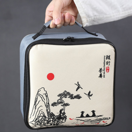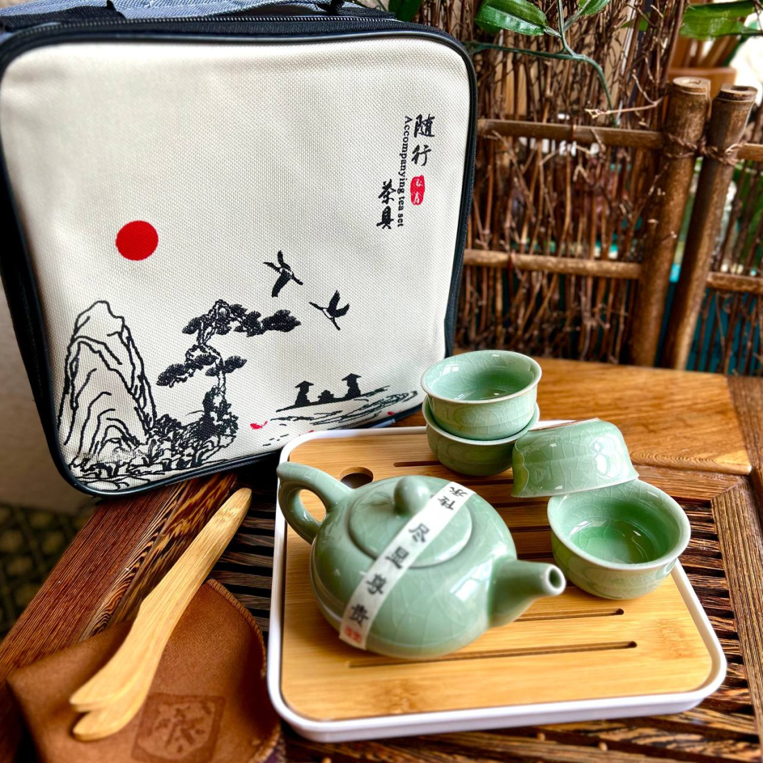 У сумці розміром 23*23*11 розміщуються: чабань 20*20 см з білою основою, рушник та дерев'яні щипці, чайник (160 мл) та 4 чаші (корисний об'єм – 35 мл, повний – 50 мл).