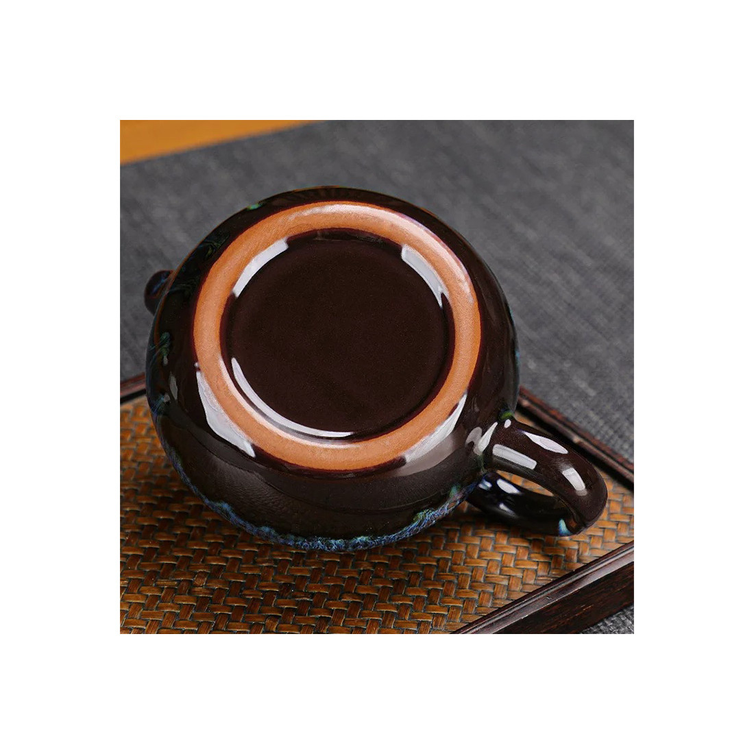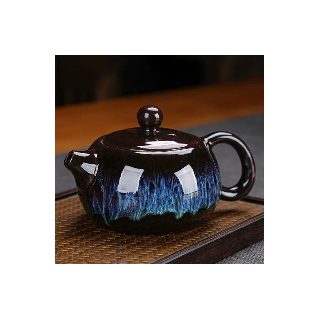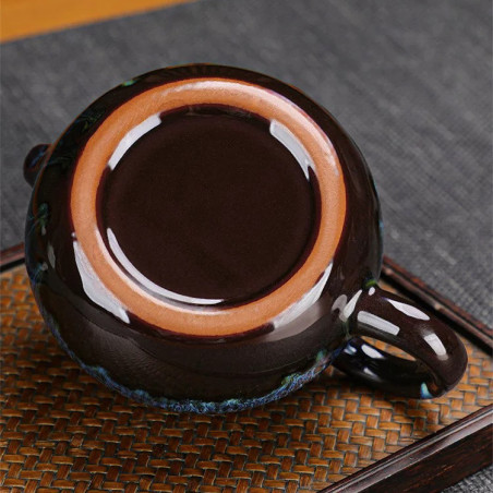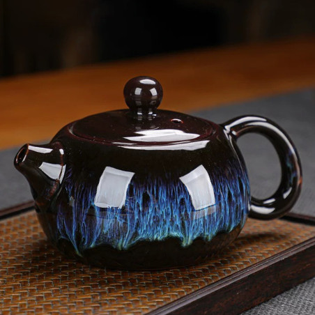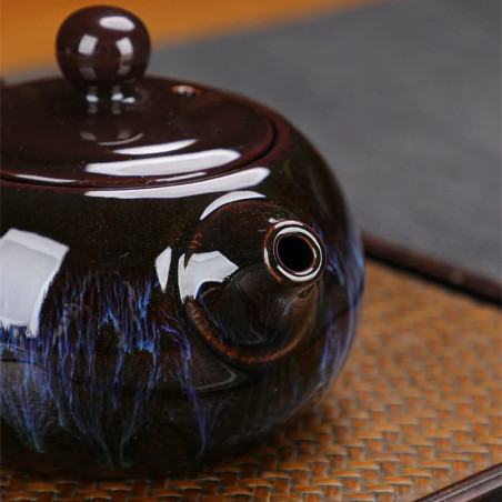 Коричнева глазур з блакитними та жовтими потіками, які хаотично утворюються під час випалу.