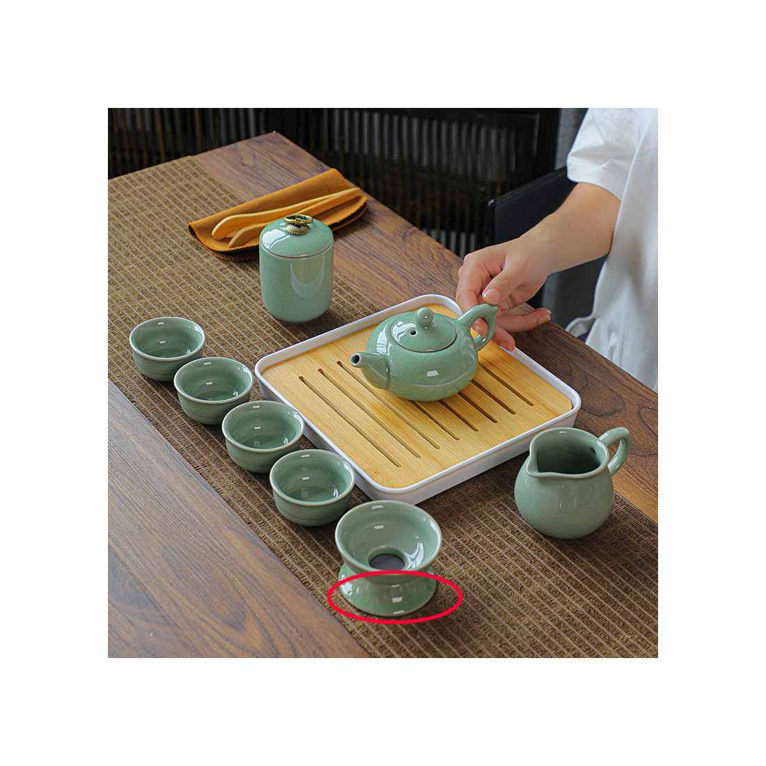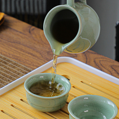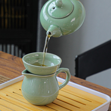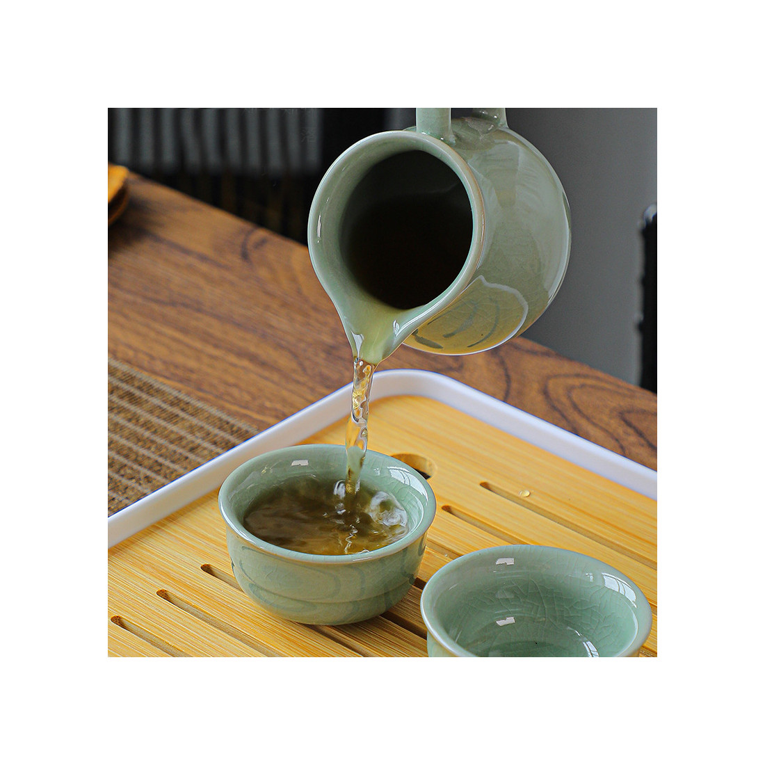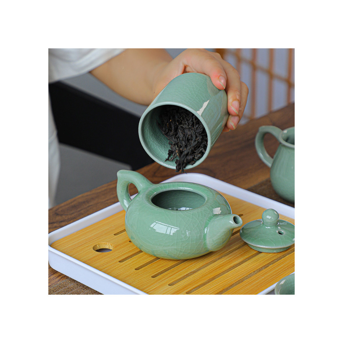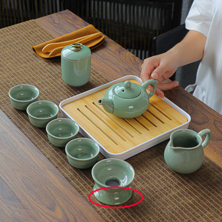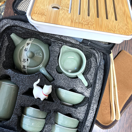 Набір кераміки ґеяо зеленого відтінку. У невеликій сумці міститься все, що необхідно для чаювання.