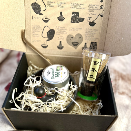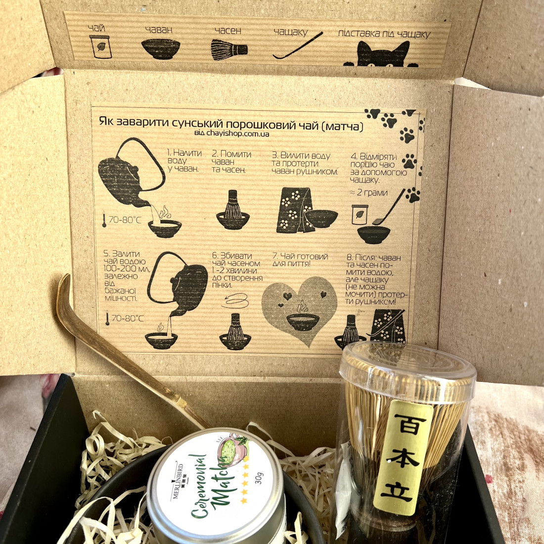 - 30 грам церемоніального сунського чаю (матча) рівня 6А у бляшанці. Чай найвищого церемоніального рівня, буде ароматним і дуже смачним.