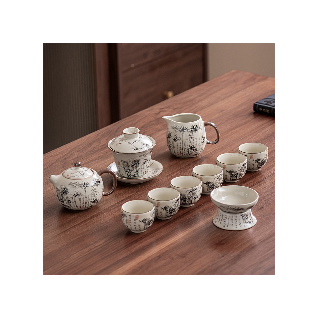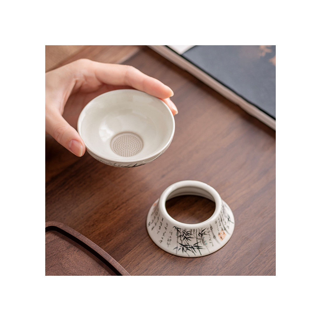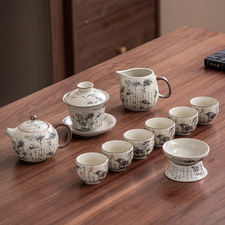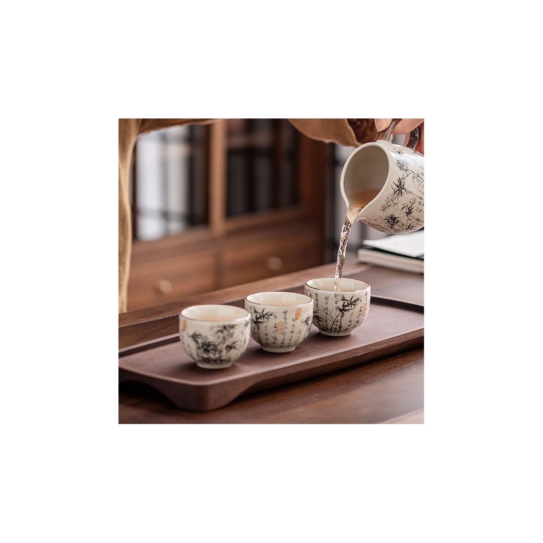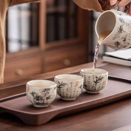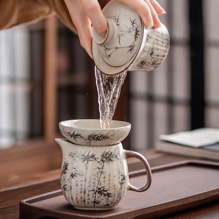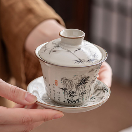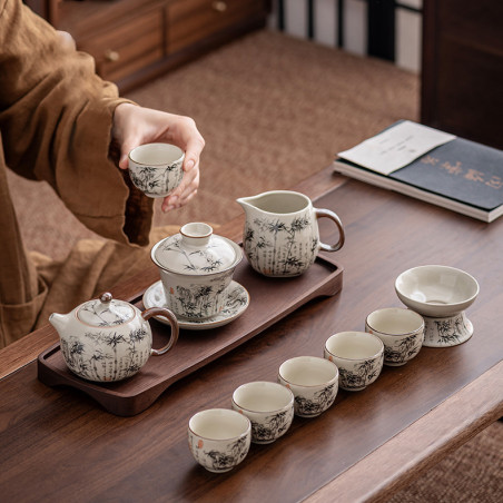 Керамічний набір з глазур'ю жуяо теплого відтінку, із зображенням бамбукового гаю та каліграфією.