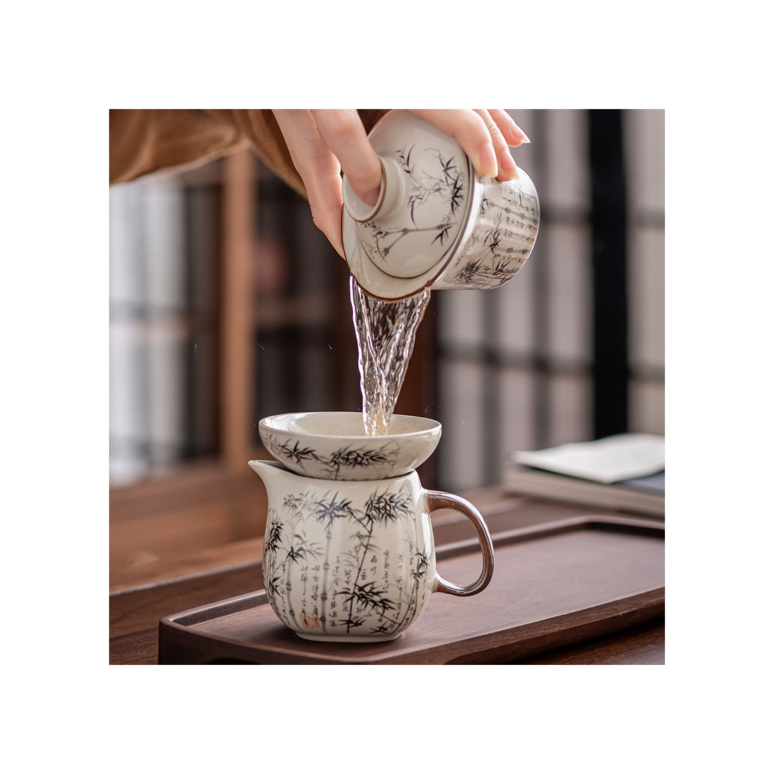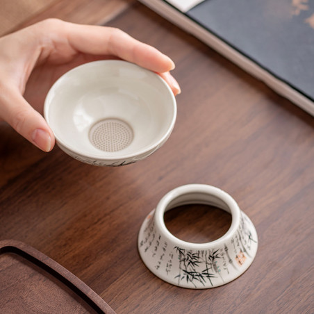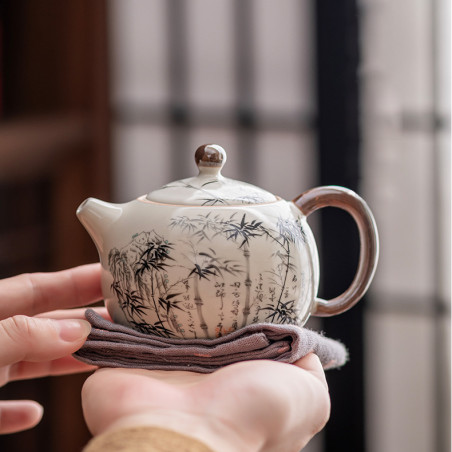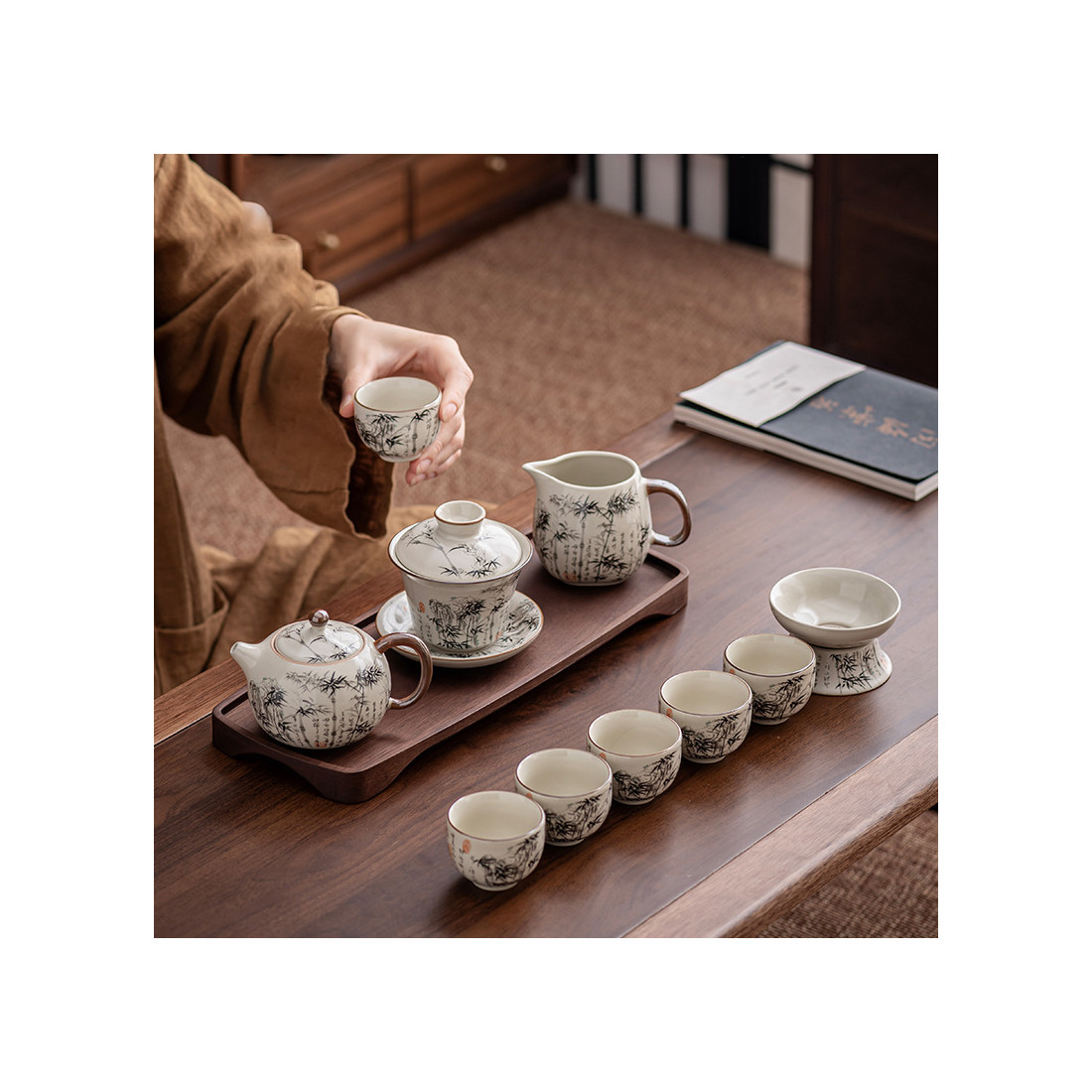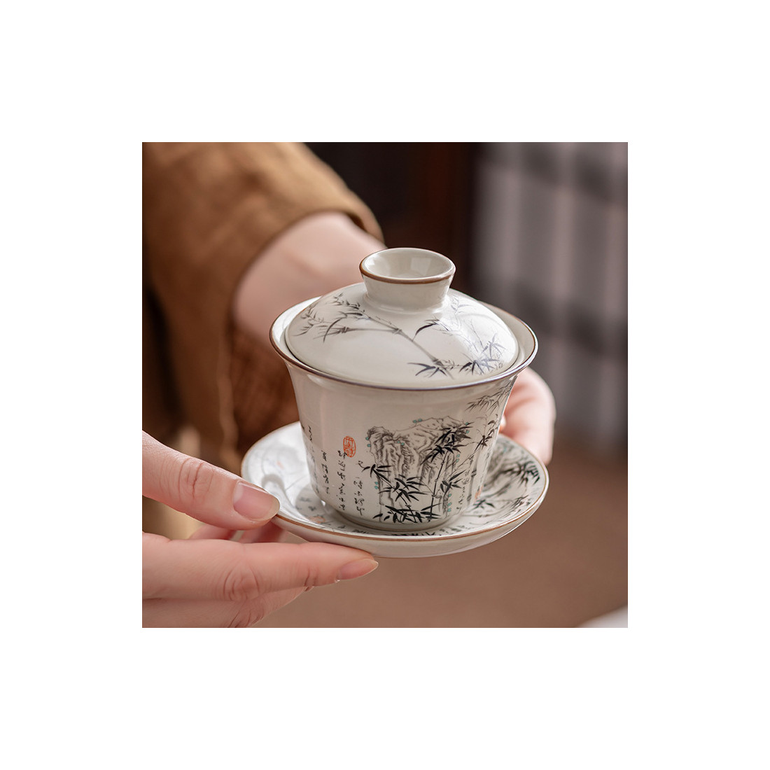 Керамічний набір з глазур'ю жуяо теплого відтінку, із зображенням бамбукового гаю та каліграфією.