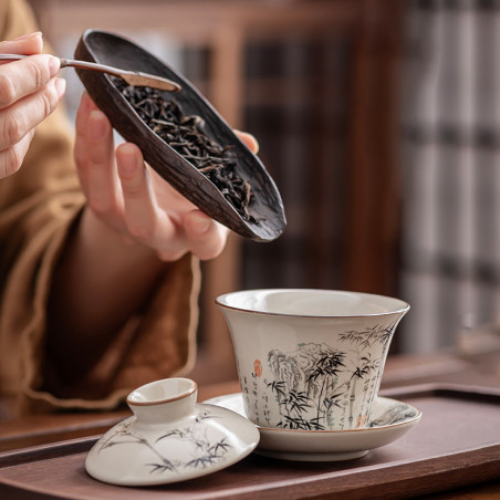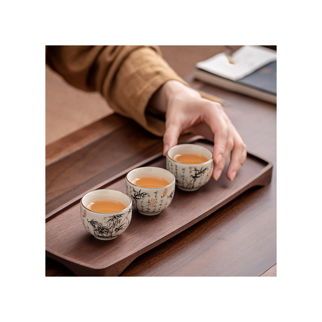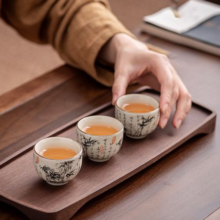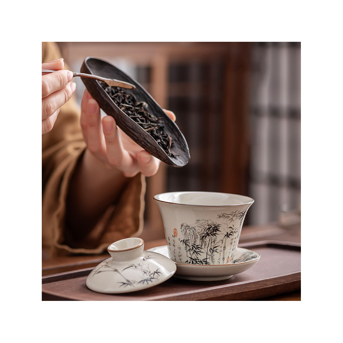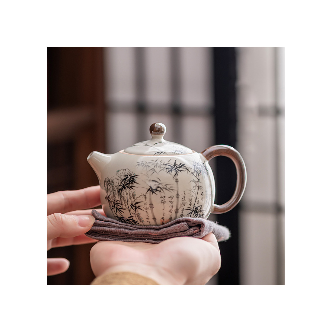 Керамічний набір з глазур'ю жуяо теплого відтінку, із зображенням бамбукового гаю та каліграфією.