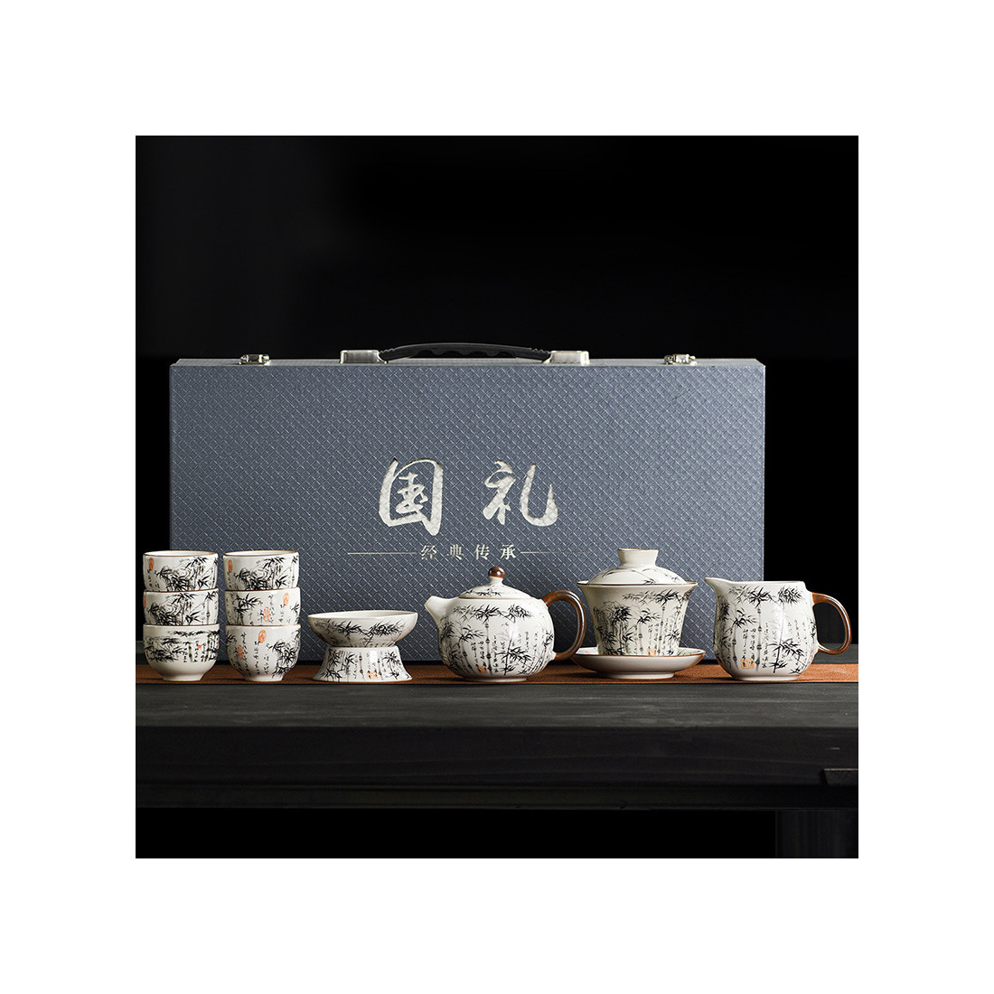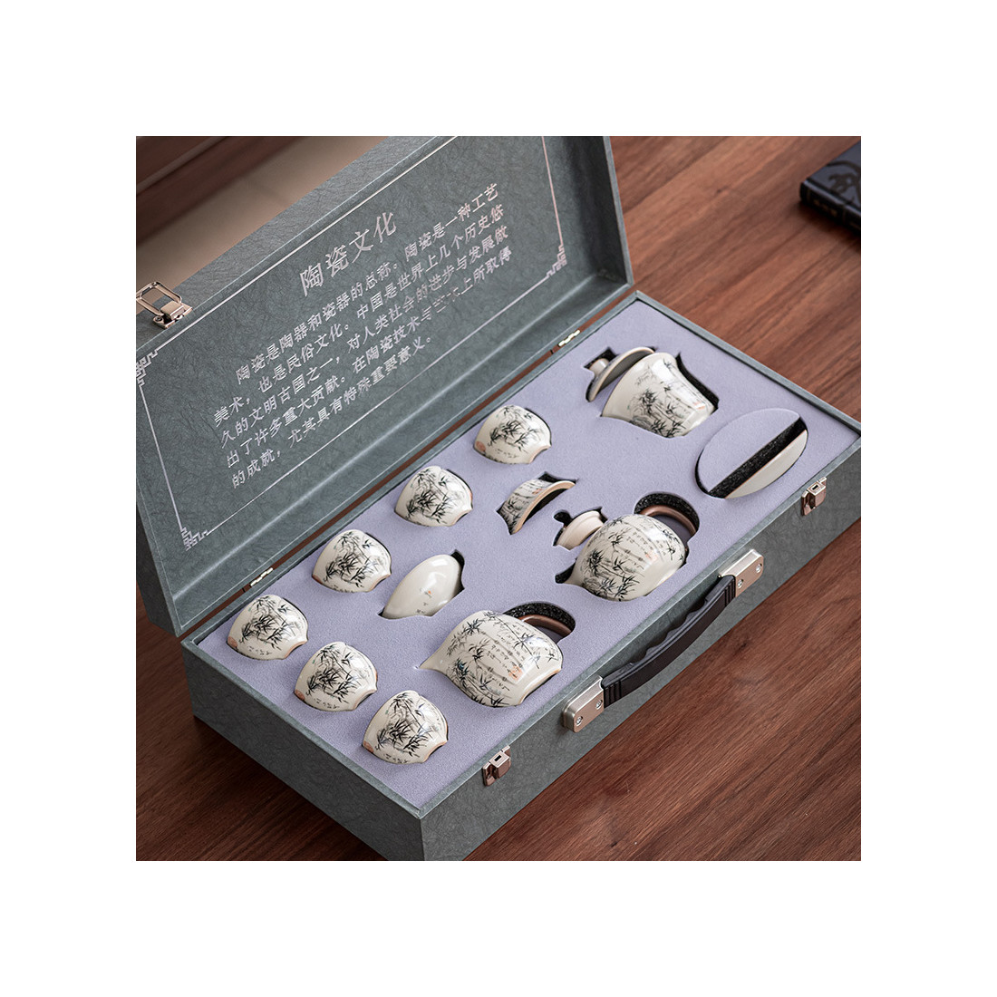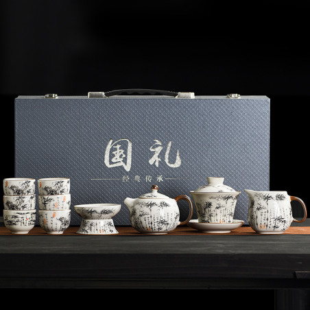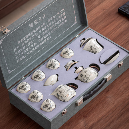 У набір входять: міцний чемодан зі шкірозамінника, ґайвань (150 мл), чайник (210 мл), чахай (240 мл), 6 чаш (корисний об'єм — 40 мл, повний об'єм — 65 мл), сито на підставці.