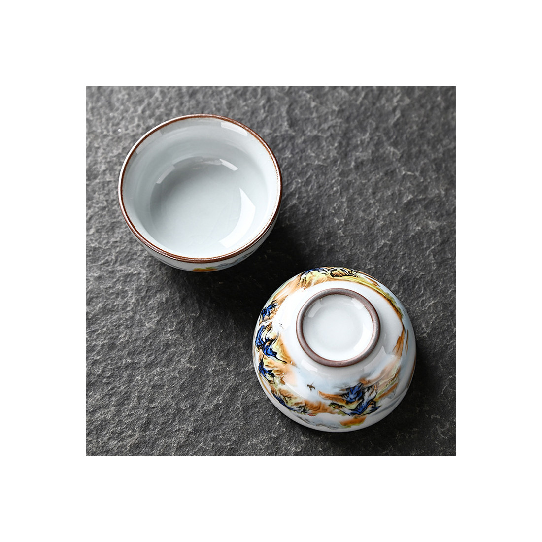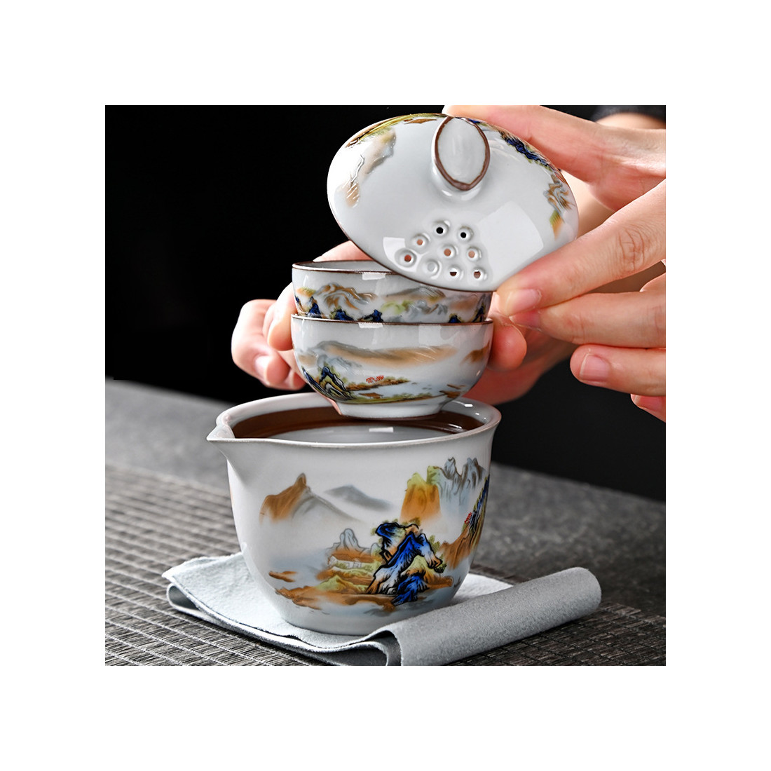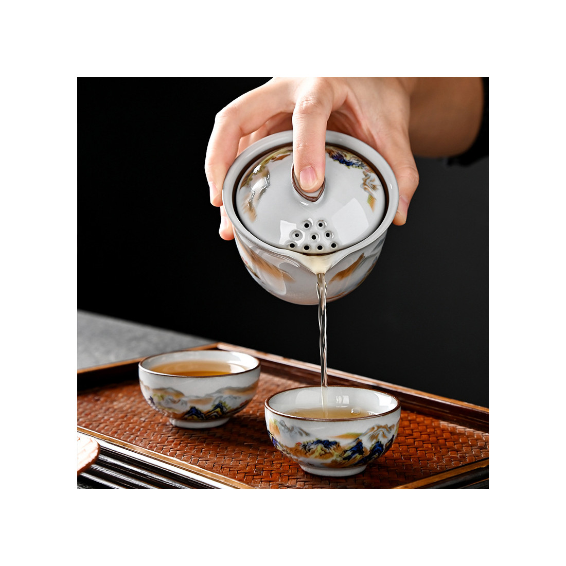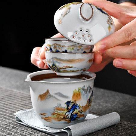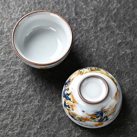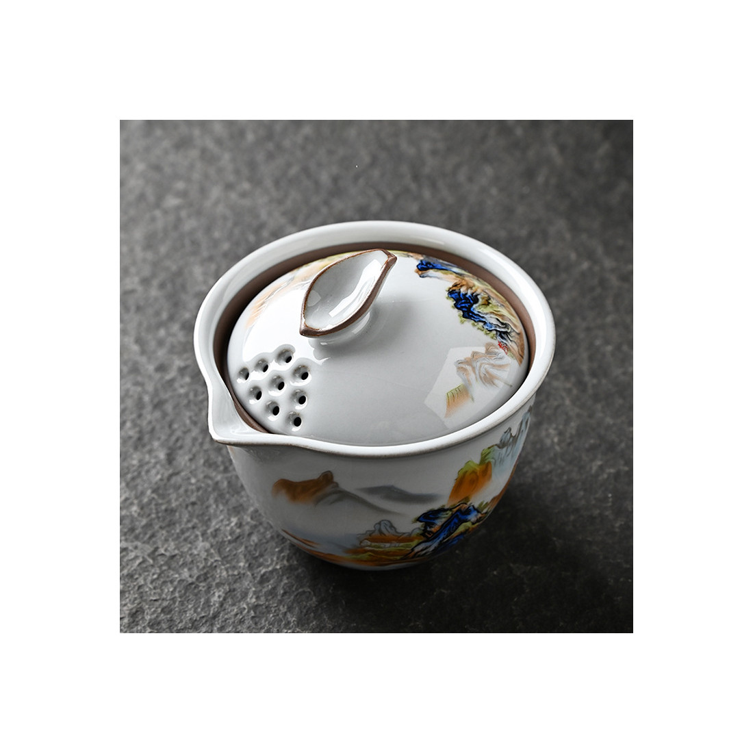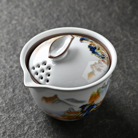 Невеликий та дуже гарний набір посуду з кераміки епохи Сунь жуяо з нанесенням кольорового малюнка. На кришці ручка зроблена у вигляді листка. Глазур товста, тому вода з чайника-гайвані зливається повільніше, ніж із звичайної керамічної. Також глазур жуяо характеризується дрібними тріщинами, які згодом профарбуються і посуд стане більш фактурним.
