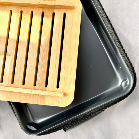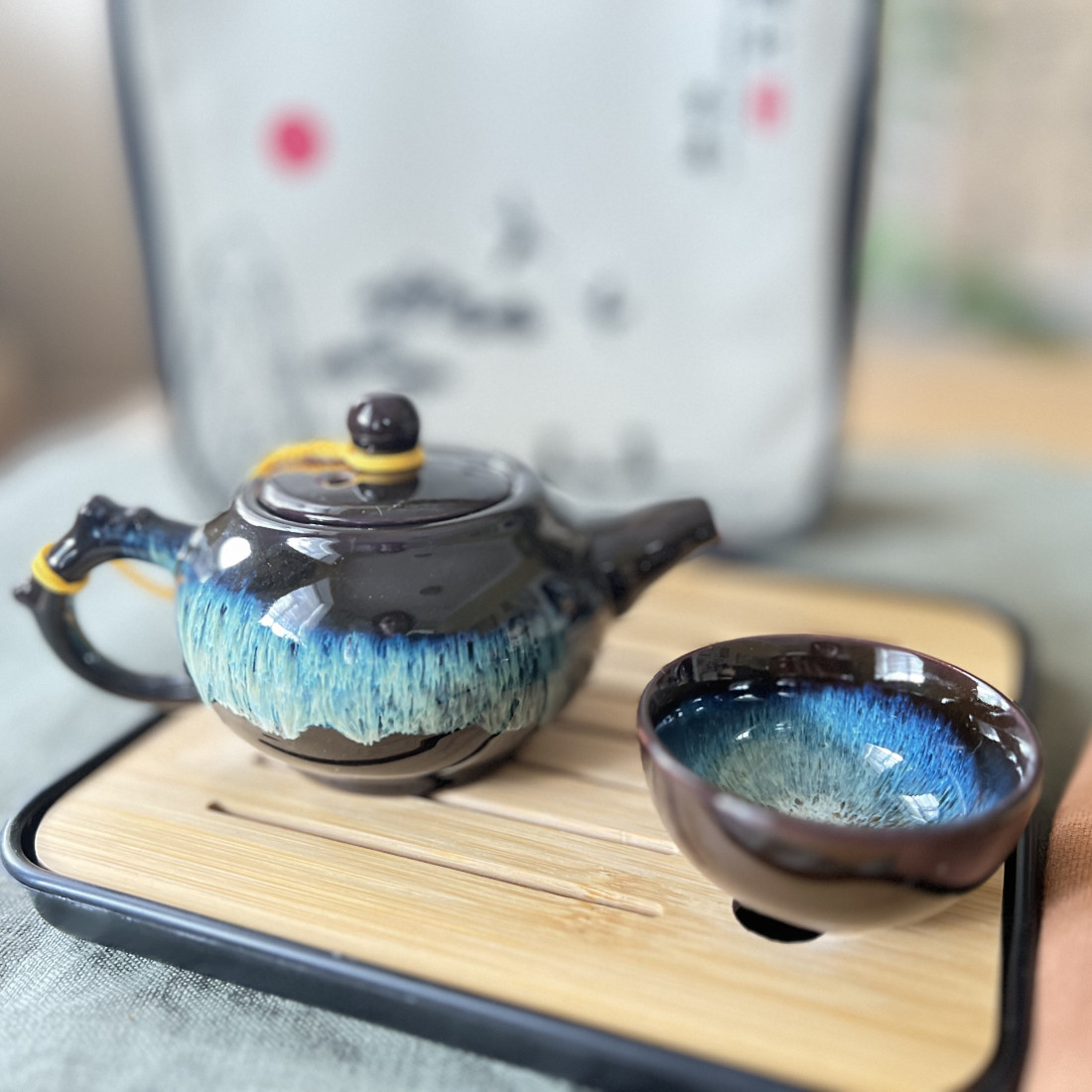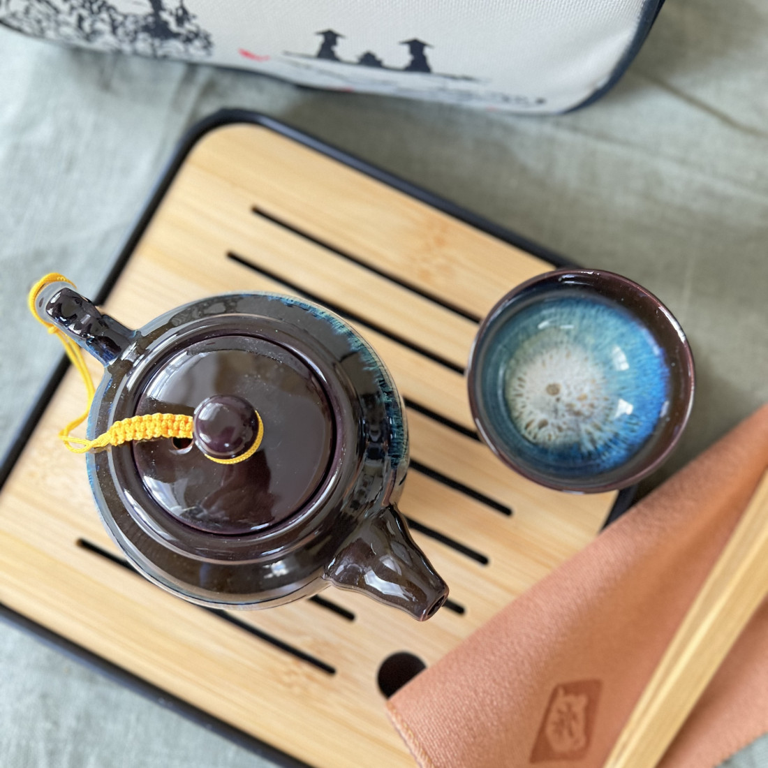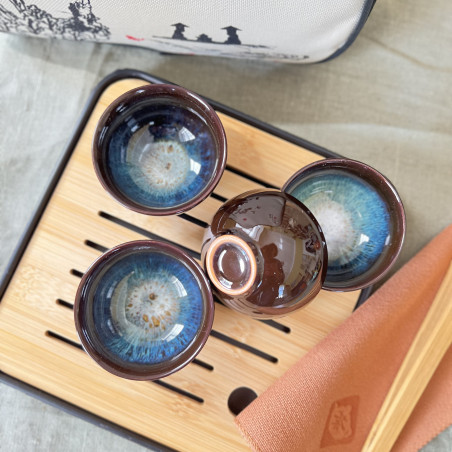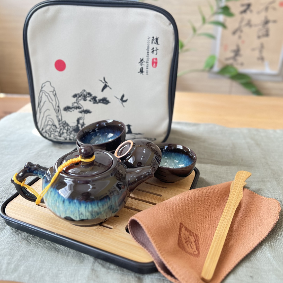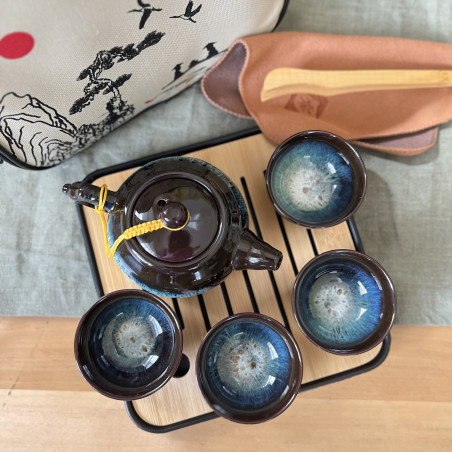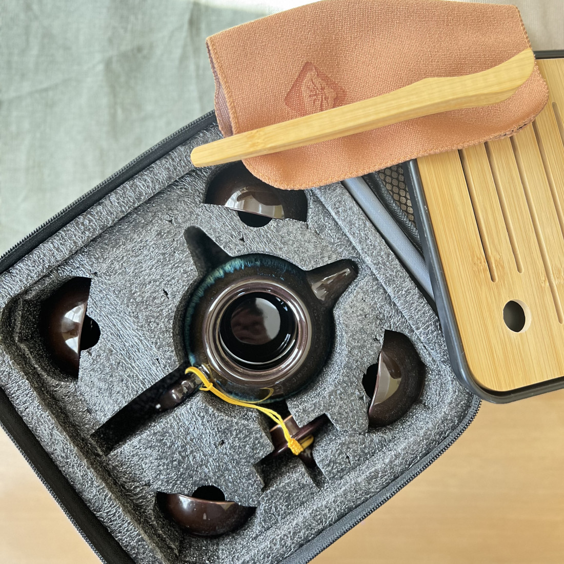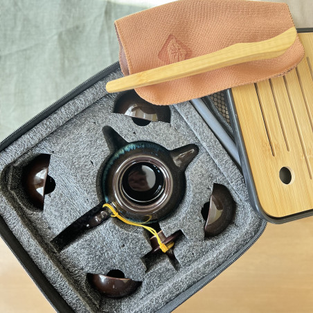 У набір входять: сумка, чабань 20*20*3 см з чорною основою, рушник та дерев'яні щипці, чайник (240 мл) та 4 чаші (корисний об'єм — 35 мл, повний — 55 мл).