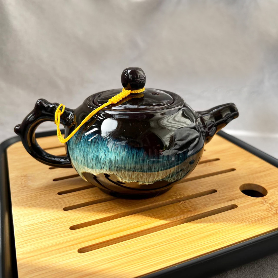 Керамічний набір з ефектарною глазур'ю. На ручці чайника і чахаю зроблено уступи, в які зручно лягає палець, при використанні посуду.