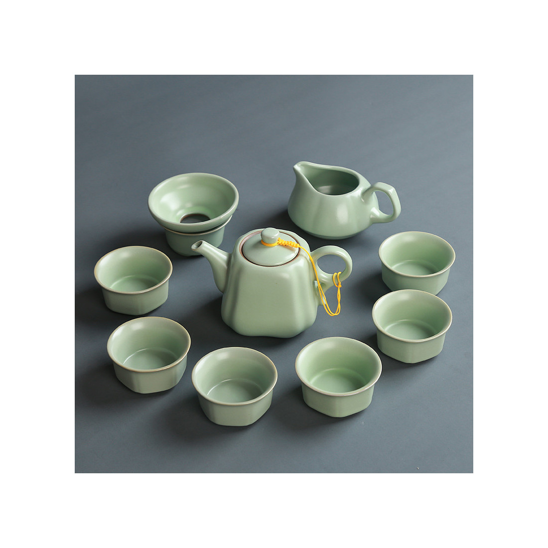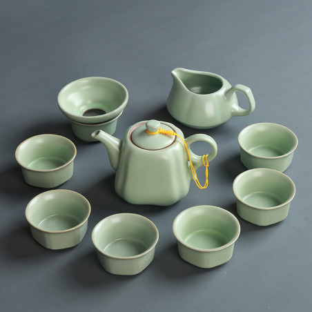 Сервіз для чаювання виконаний з кераміки жуяо ніжно-зеленого кольору (тяньцін, 天青). Класична кераміка без малюнка.