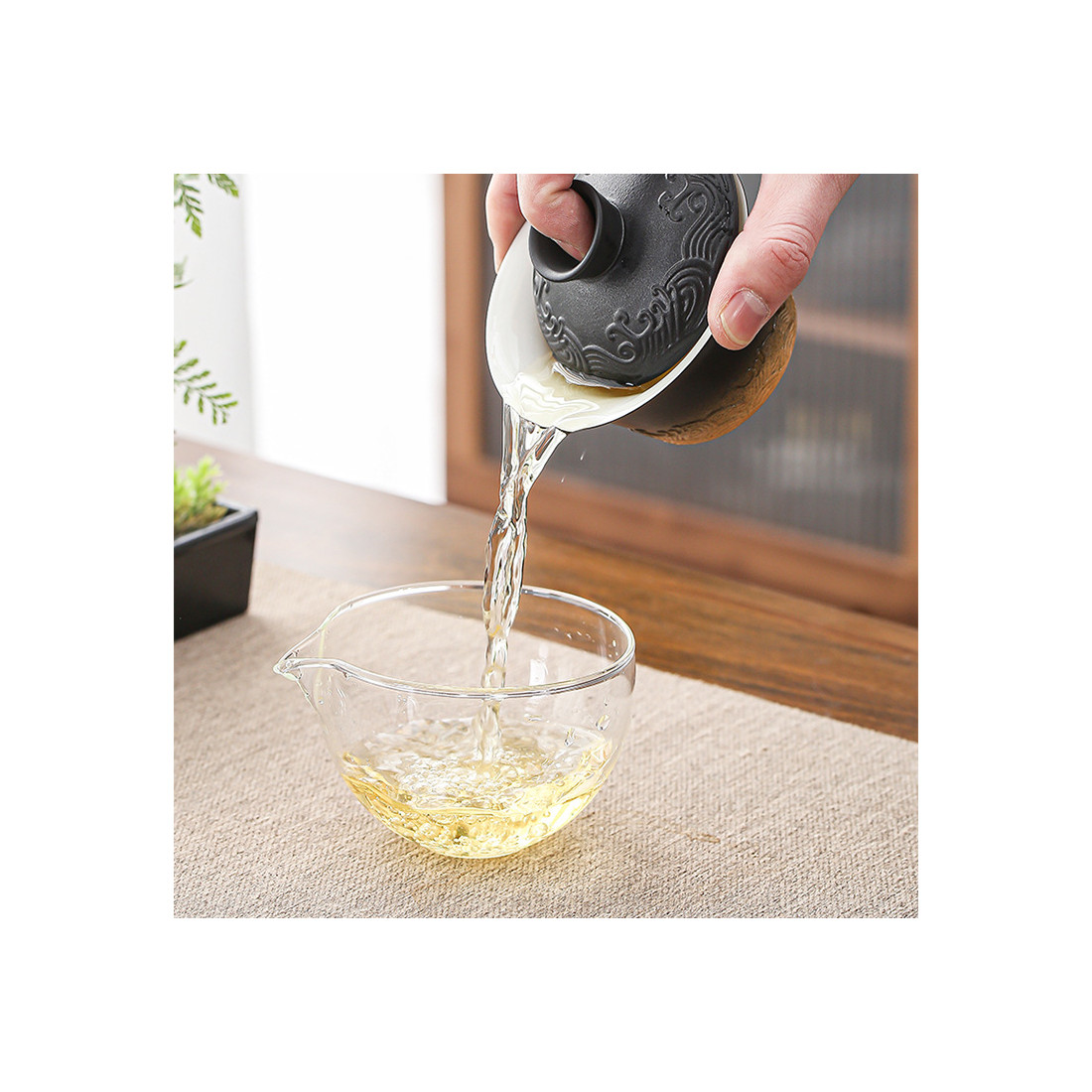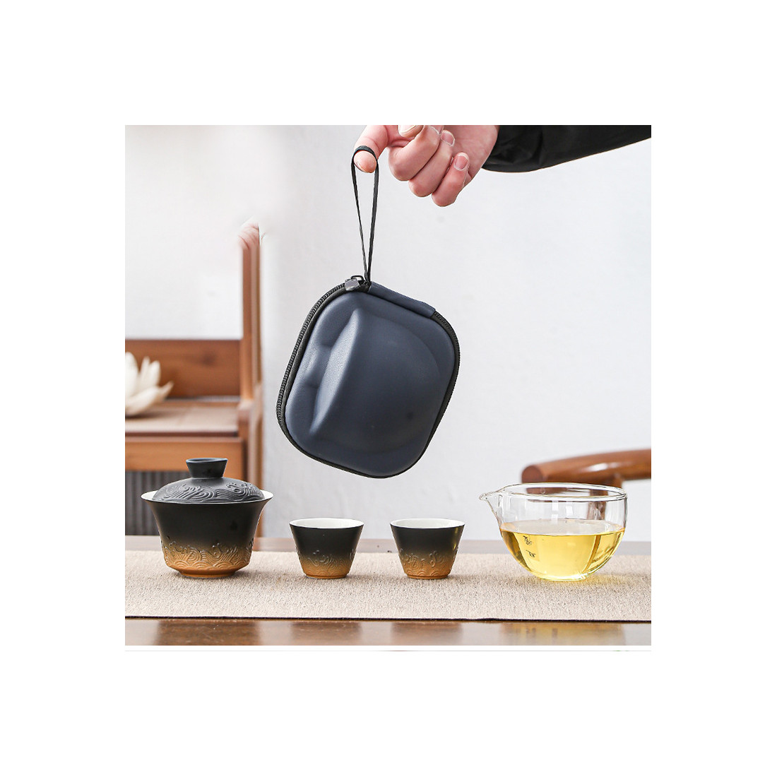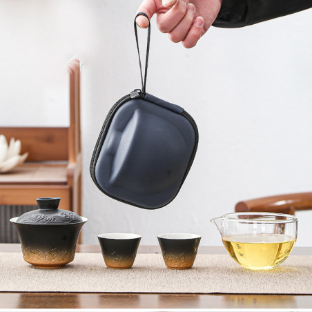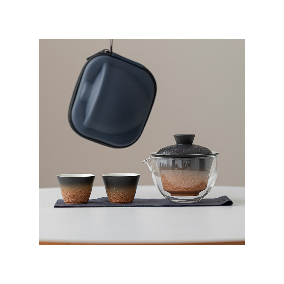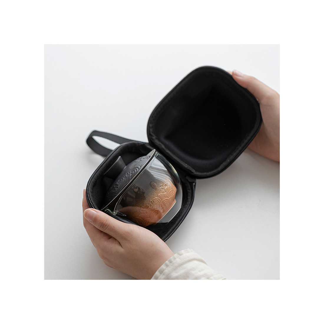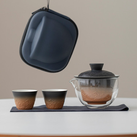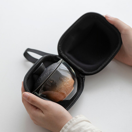 Невелика сумочка з керамічним посудом та скляним чахаєм. Керамічний посуд з рельєфним зображенням бурхливих хвиль, коричнево-чорним покриттям, але білий усередині. Скляний чахай виглядає досить міцно. Прокладаючи рушник між предметами, ви додатково захищаєте посуд при перенесенні.