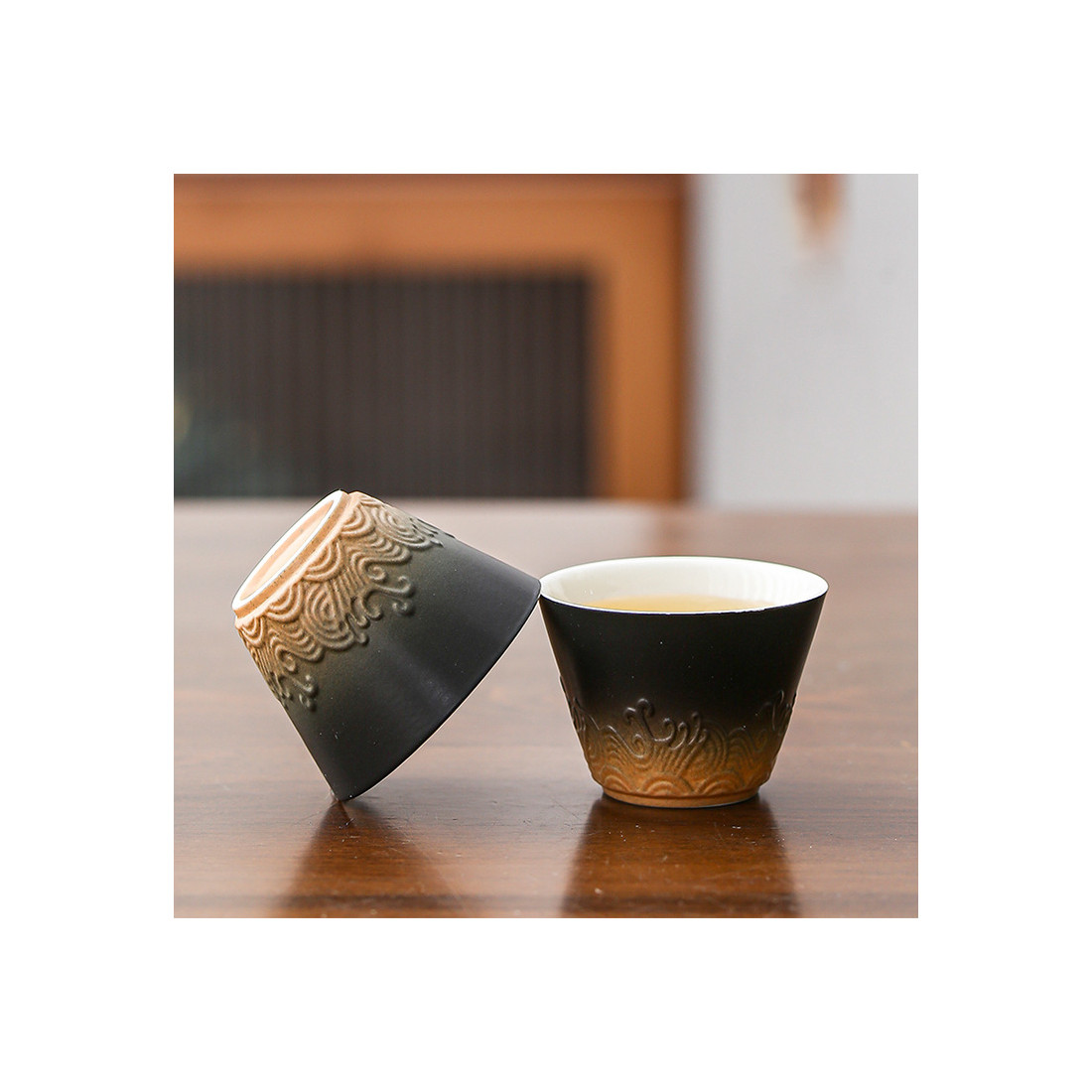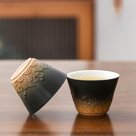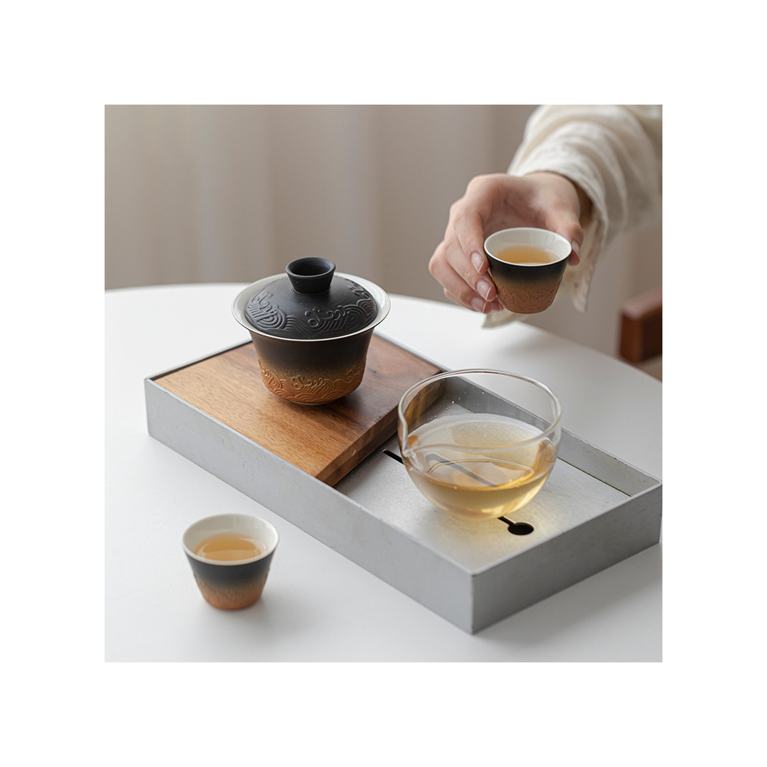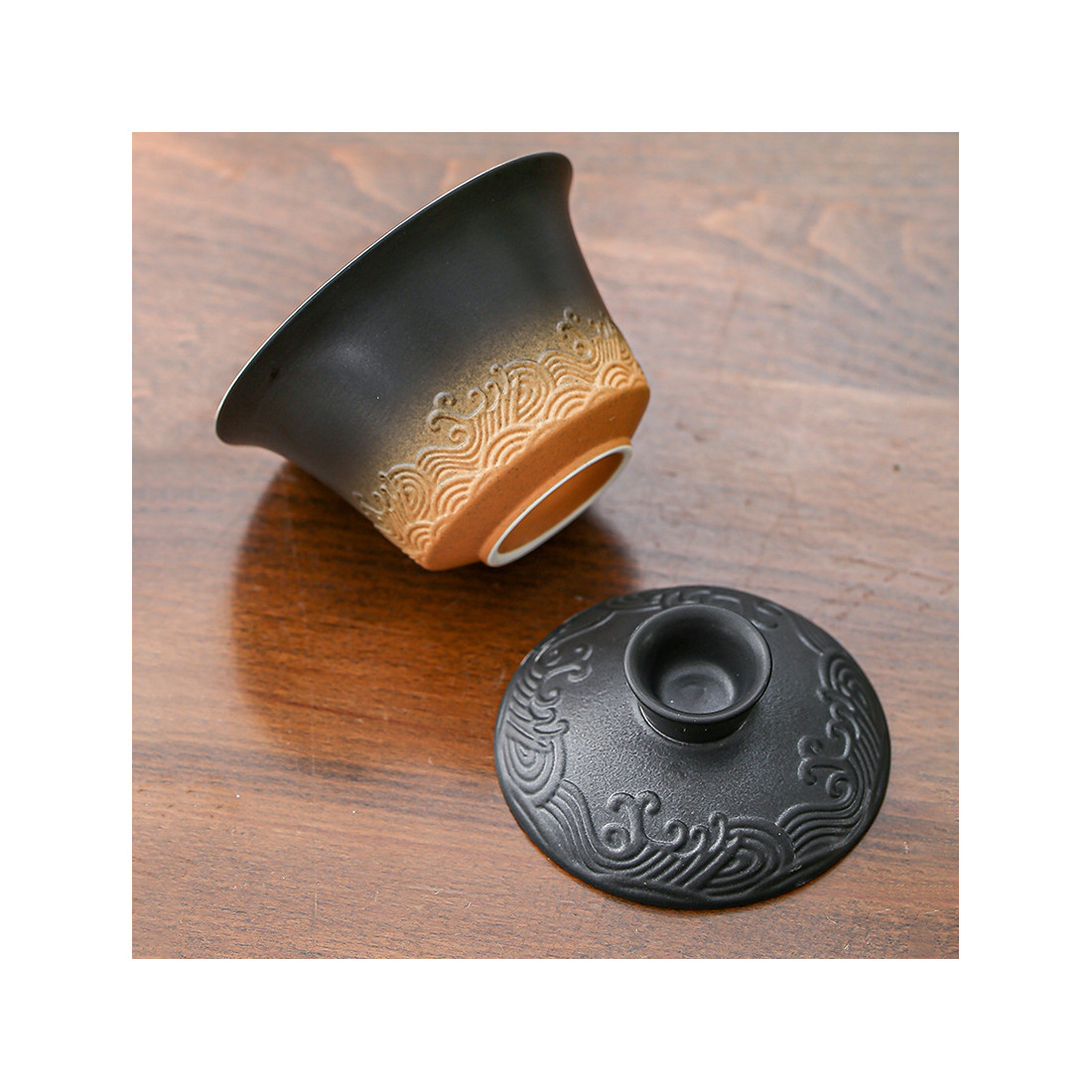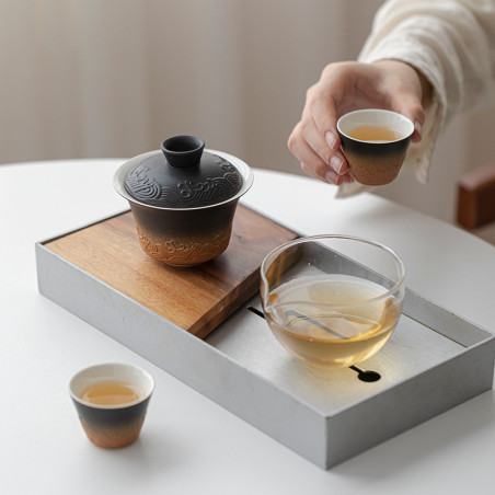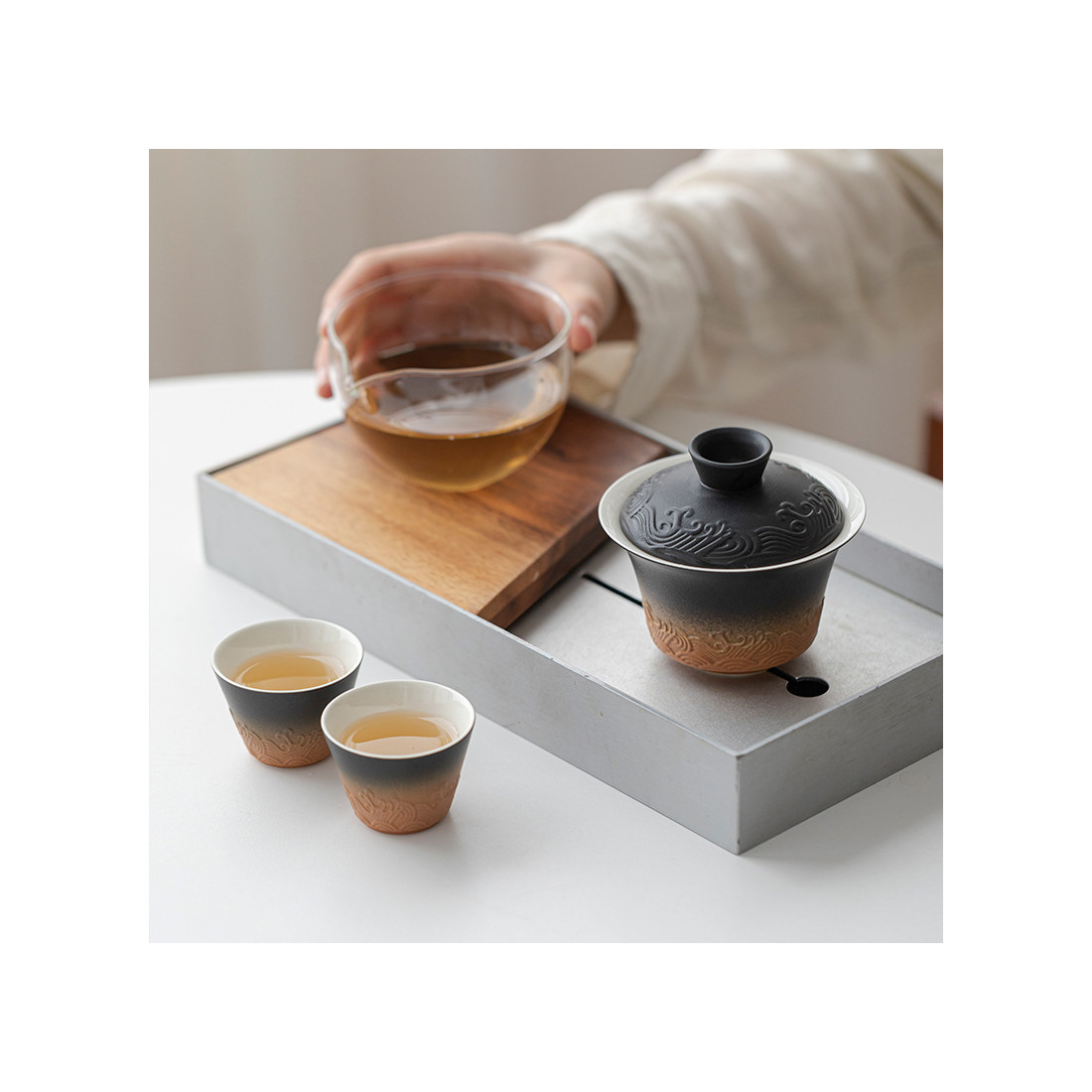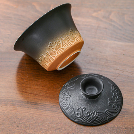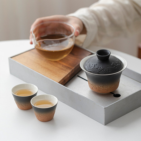 Невелика сумочка з керамічним посудом та скляним чахаєм. Керамічний посуд з рельєфним зображенням бурхливих хвиль, коричнево-чорним покриттям, але білий усередині. Скляний чахай виглядає досить міцно. Прокладаючи рушник між предметами, ви додатково захищаєте посуд при перенесенні.