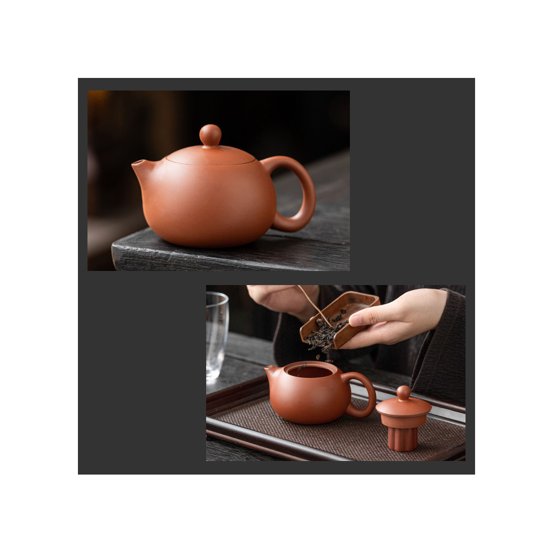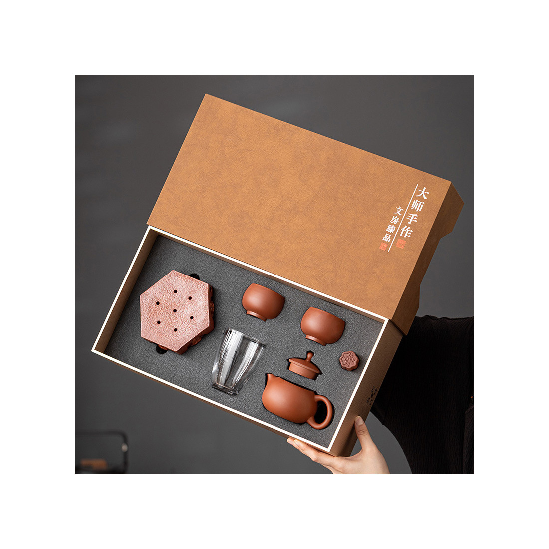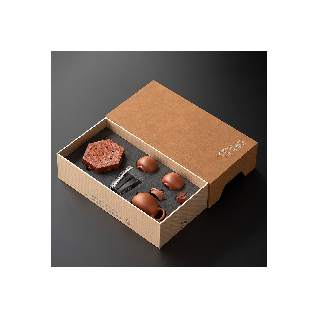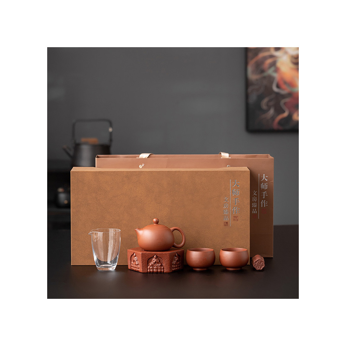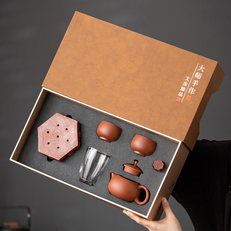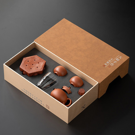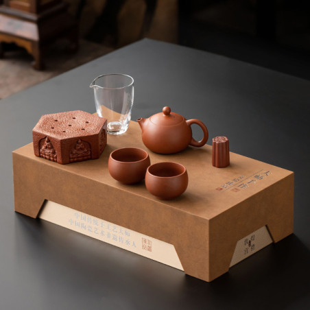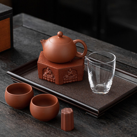 Чайник та чаші виготовлені з їсінської глини чжуні 朱泥. Чайник форми "Сіші", об'ємом 200 мл. Прекрасні технічні характеристики: водний рівень та відмінний злив. Чаші з корисним об'ємом 60 мл (повний 100 мл) виконані у формі "чаші архату". Скляний чахай 200 мл. Також в комплект входять аксесуари зі звичайної кераміки: посуд, що живить чайник із зображенням будд і підставка під кришку.