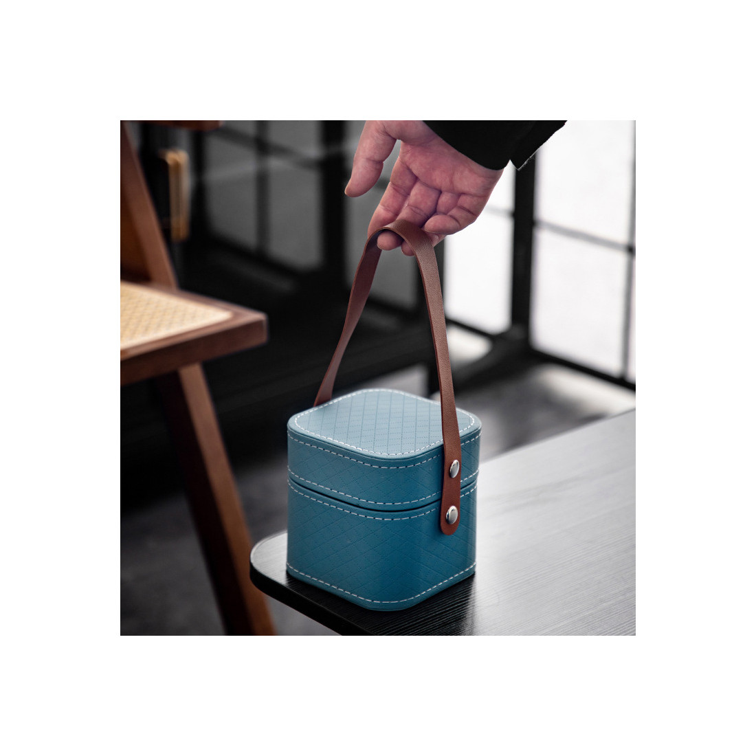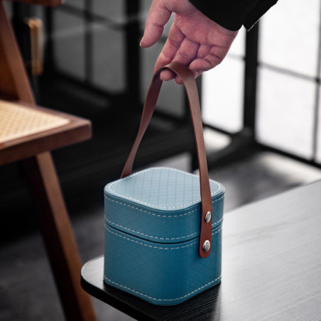 Чайний набір для індивідуального чаювання. Посуд з барвистим глазур'ю з потьоками ідеально поміщається в красивий квадратний футляр.
