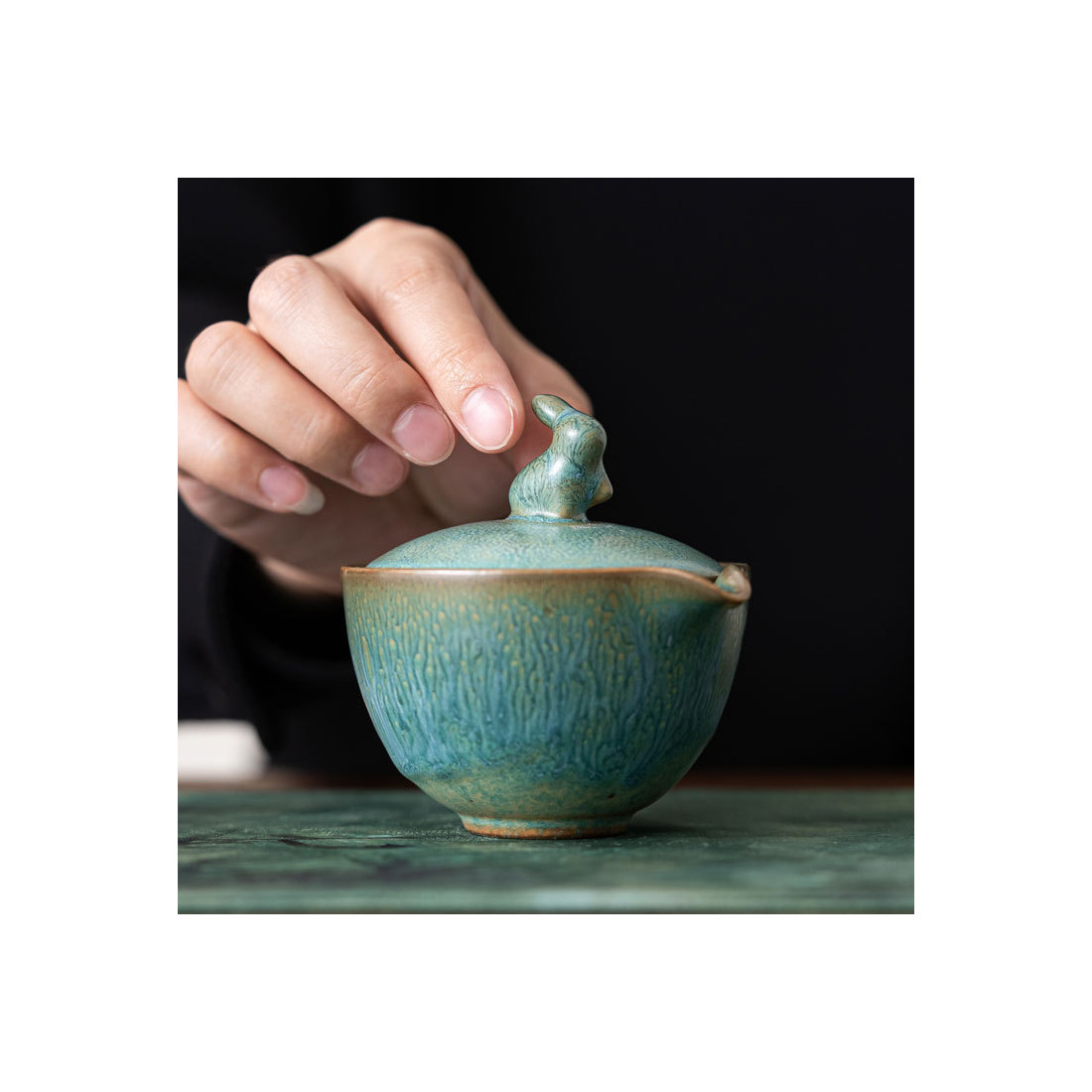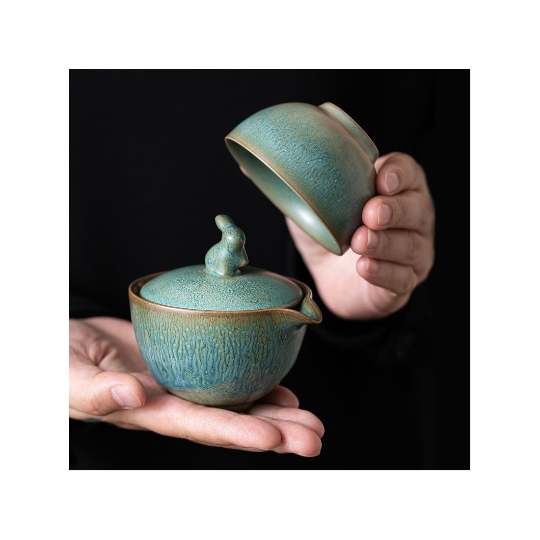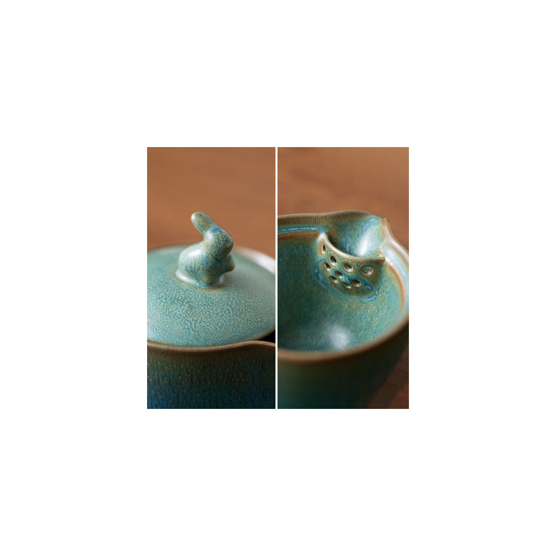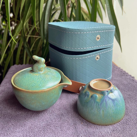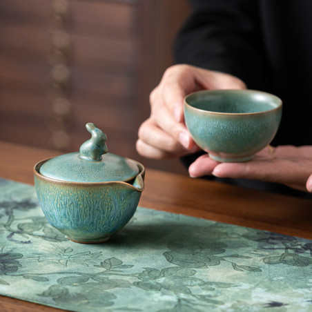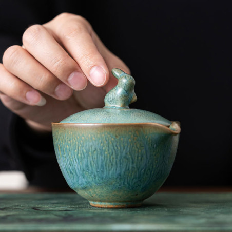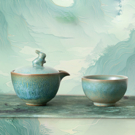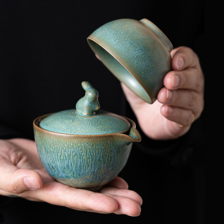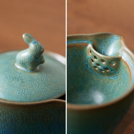 Глазур з ефектом яобянь, тобто остаточно колір і малюнок формуються у печі. Форма та якість виробу прекрасна. На кришці у вигляді ручки кролик/заєць. Прекрасний набір для заварювання на одну особу. Невеликий об'єм, а чаша ідеально підходить під чайник-гайвань.