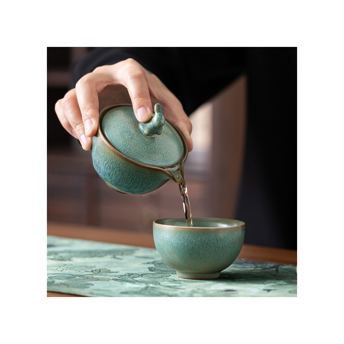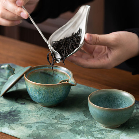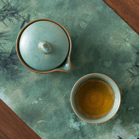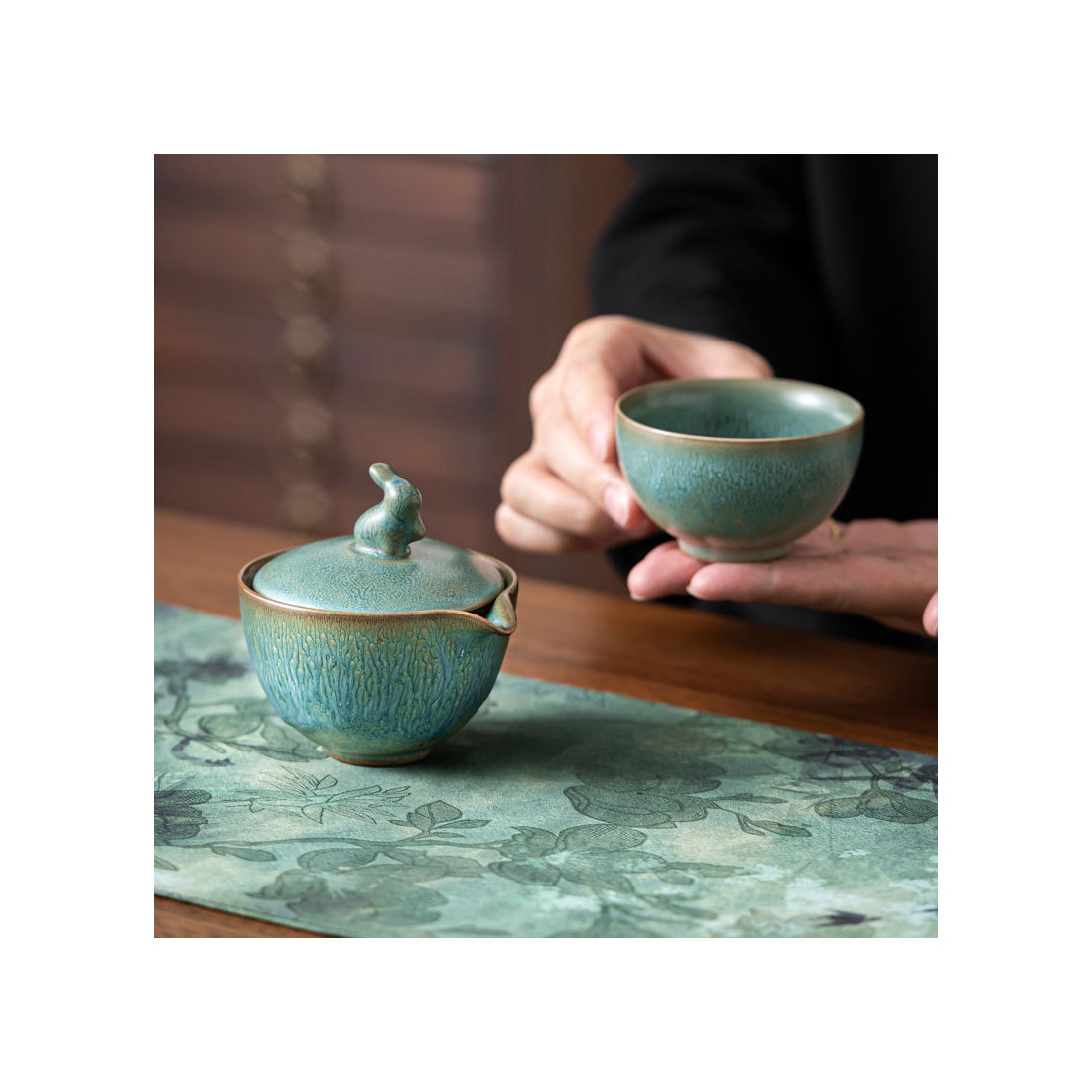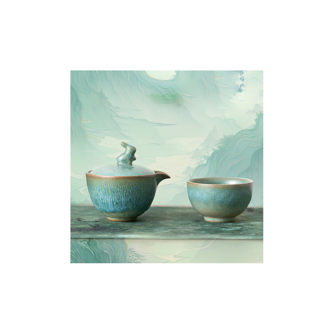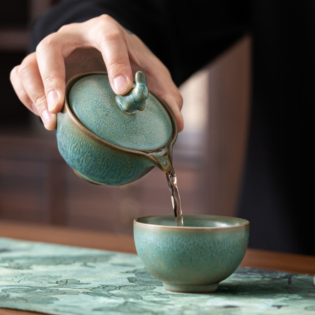 Глазур з ефектом яобянь, тобто остаточно колір і малюнок формуються у печі. Форма та якість виробу прекрасна. На кришці у вигляді ручки кролик/заєць. Прекрасний набір для заварювання на одну особу. Невеликий об'єм, а чаша ідеально підходить під чайник-гайвань.