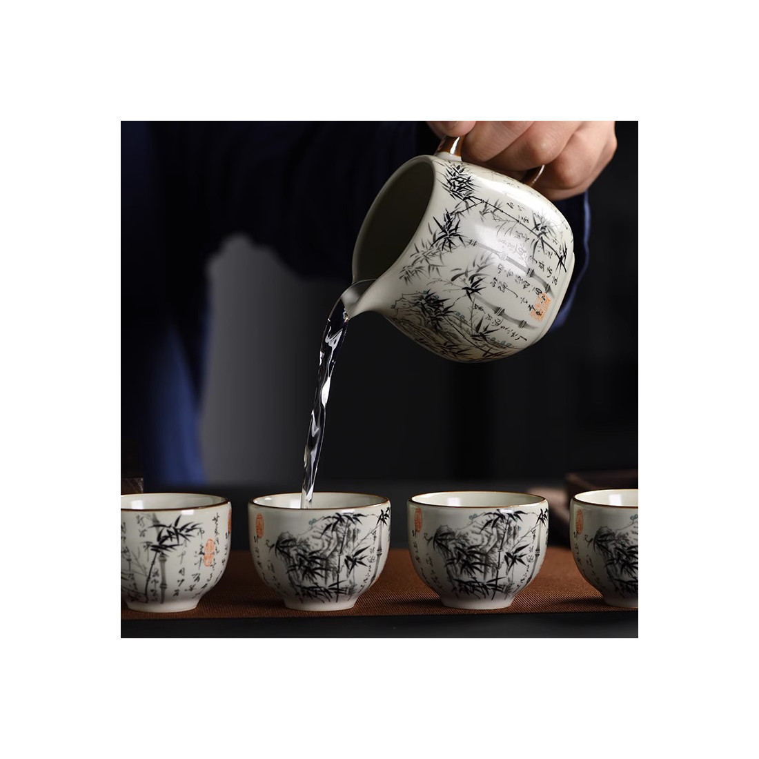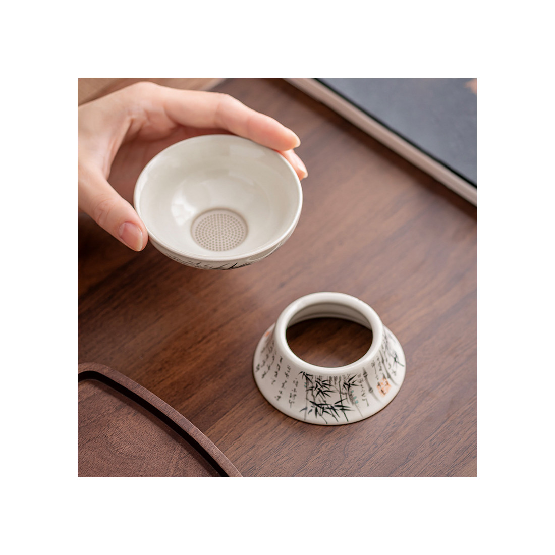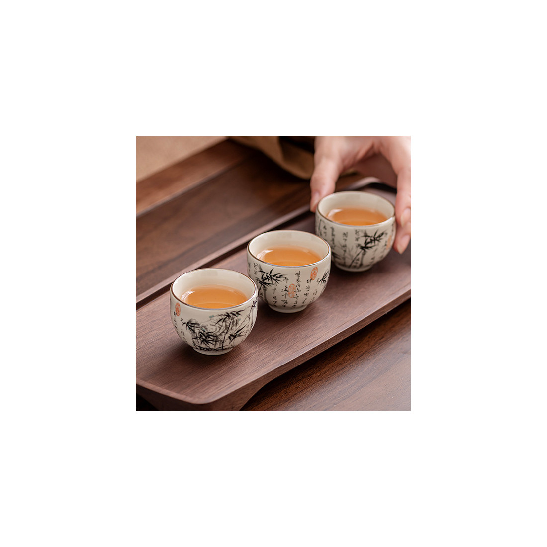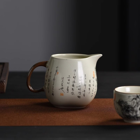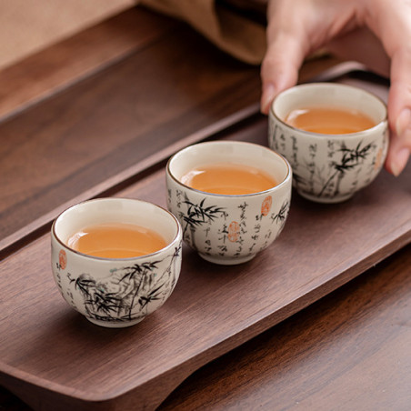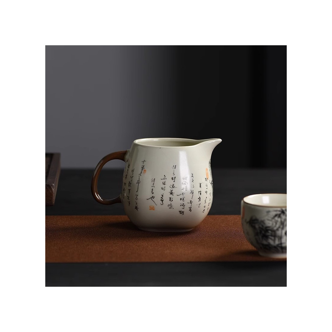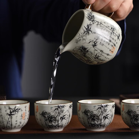 Керамічний набір з глазур'ю жуяо теплого відтінку, із зображенням бамбукового гаю та каліграфією.