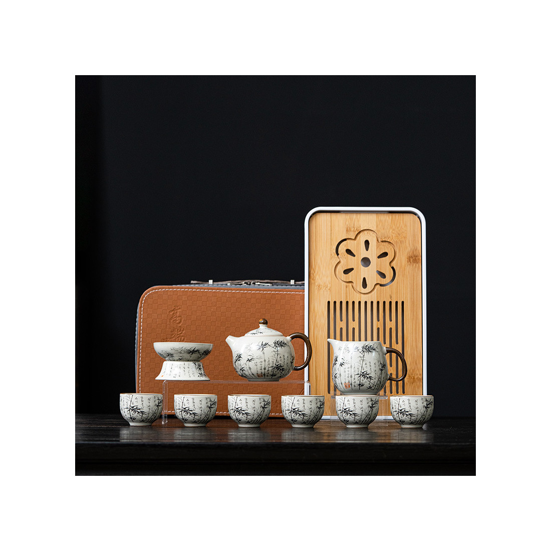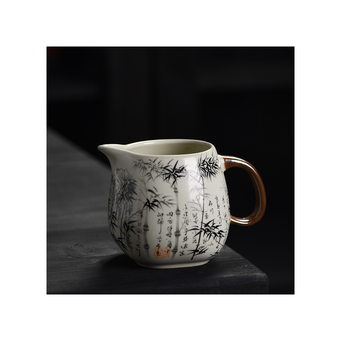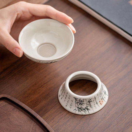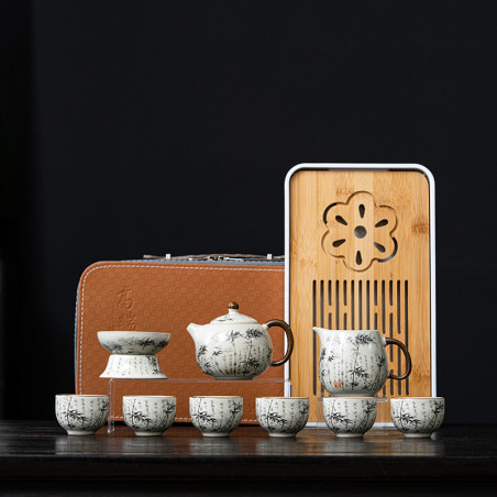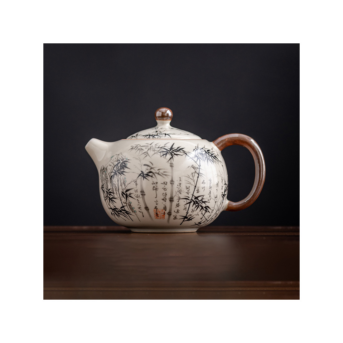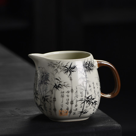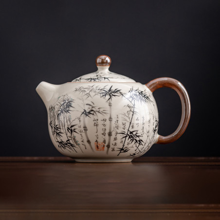 Керамічний набір з глазур'ю жуяо теплого відтінку, із зображенням бамбукового гаю та каліграфією.